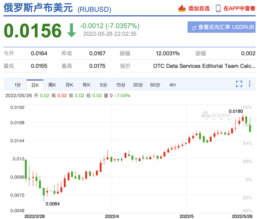 尽管,卢布兑美元汇率出现了短期下挫,但自2022年3月10日以来,卢布汇率持续走强,一度冲上热搜。据莫斯科交易所数据显示,截至当地时间5月25日,美元兑卢布汇率一度跌破56,创四年以来最低新纪录;另外,欧元兑卢布汇率一度跌破58,创下近7年以来最低新纪录。