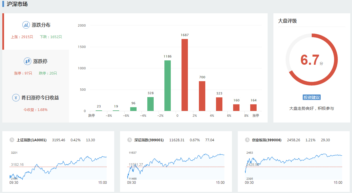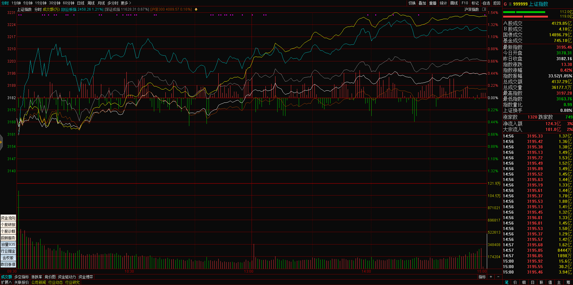导语: 三大指数午后震荡走高,截至收盘,沪指涨0.42%,深成指涨0.67%,创业板指涨1.21%。沪深两市全天成交额8951亿元。汽车整车、半导体及元件、科创次新股、汽车零部件等板块涨幅居前,互联网彩票、煤炭开采加工等板块飘绿。两市超2900只个股上涨,北向资金全天净买入31.83亿元。盘面上,科创次新股午后暴拉,带领科创50指数涨近5%,板块内莱特光电、华依科技、精进电动、灿勤科技、正元地信20cm涨停,概伦电子、禾川科技等多股涨超10%;汽车整车板块全天活跃,安凯客车、东风汽车、小康股份、亚星客车、北汽蓝谷、金龙汽车涨停;半导体及元件板块迎来大涨,景旺电子、至纯科技涨停,安路科技涨超15%;昨日被爆炒的互联网彩票板块今日全天领跌,鸿博股份、龙韵股份双双跌停。