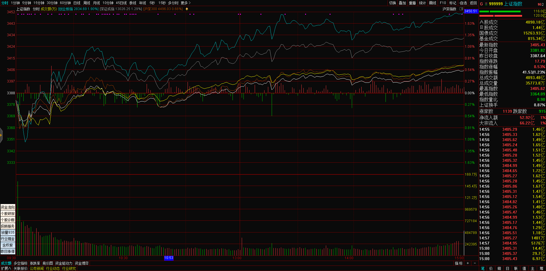 10:35 据同花顺(300033)iFinD数据,截至目前,沪深两市成交额突破5000亿元,其中沪市成交额2004亿元,深市成交额3011亿元。