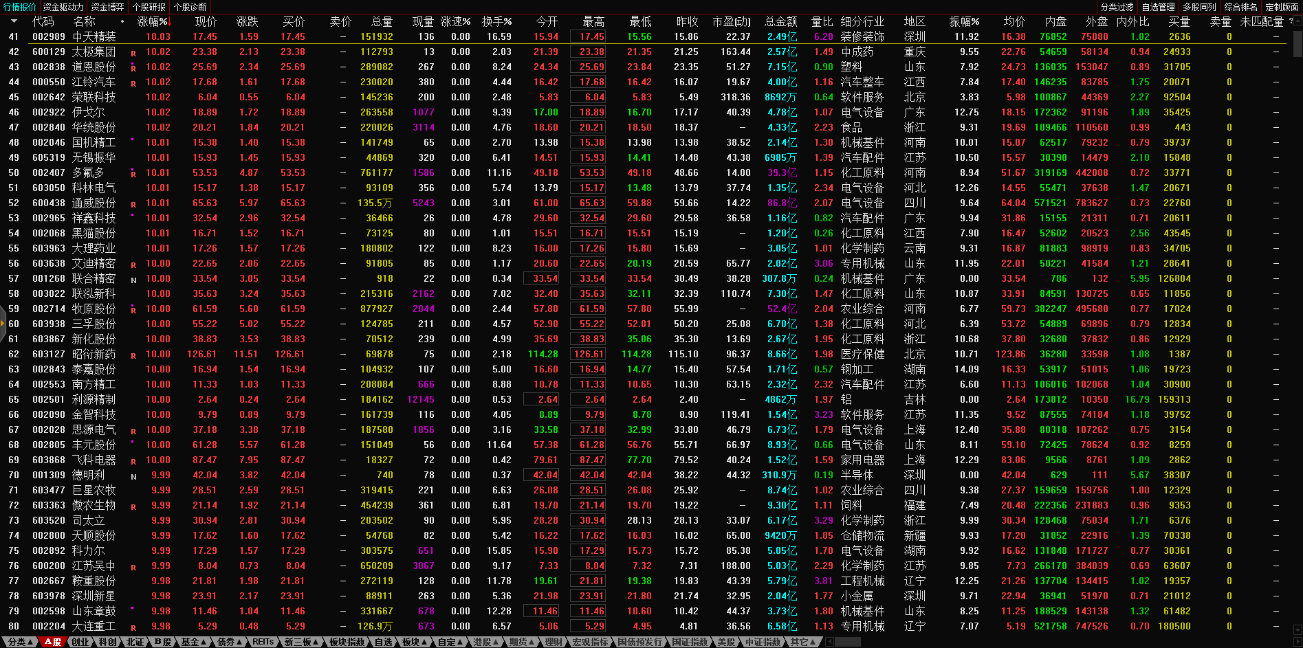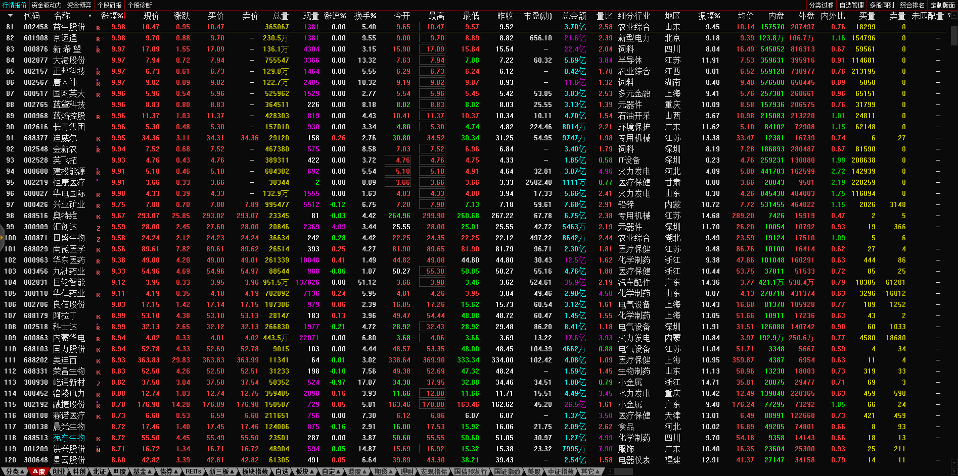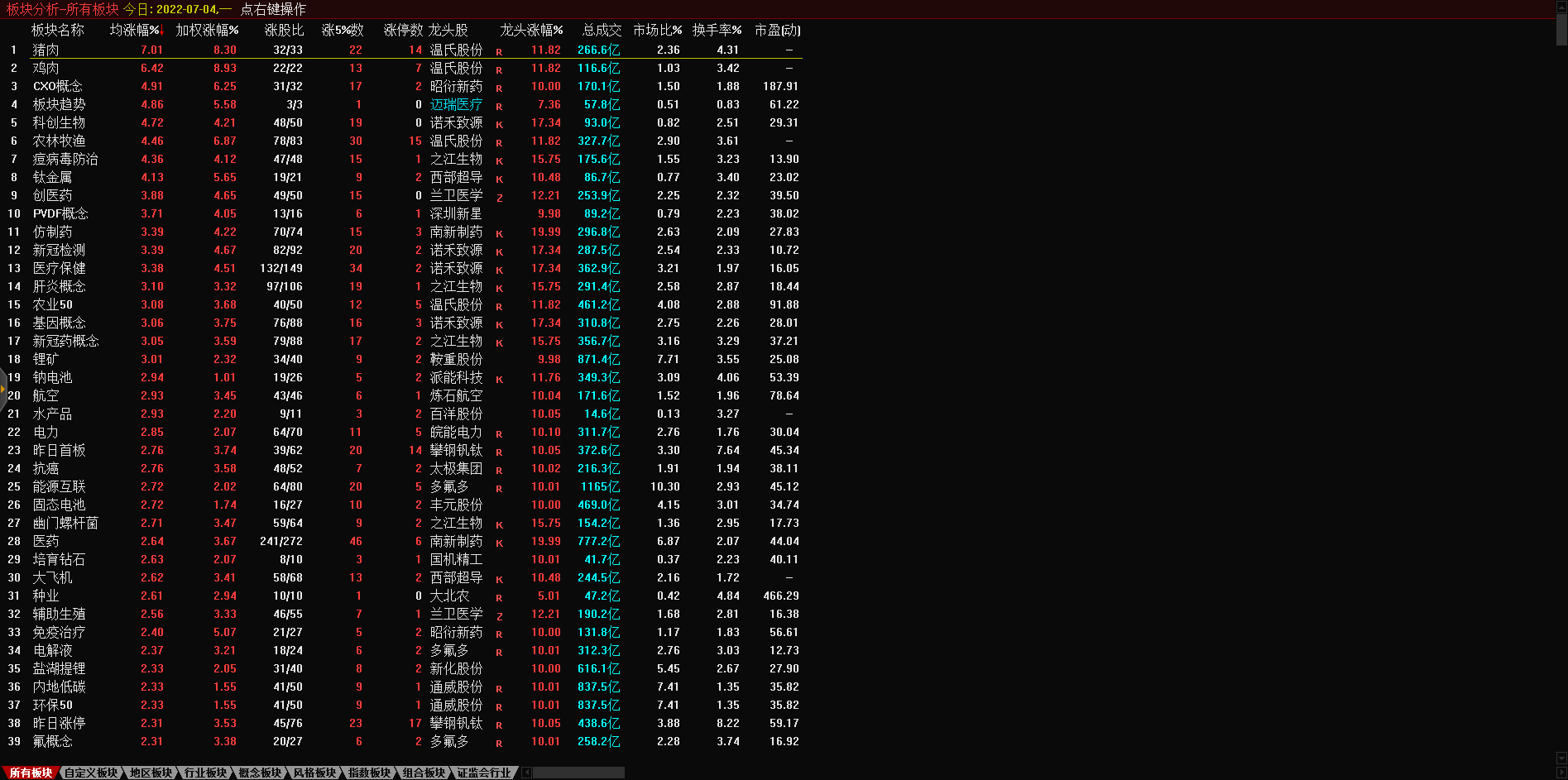 今日截至截稿,猪肉概念板块整体上涨5.66%。板块内个股暴力拉升,天康生物(002100)、巨星农牧(603477)、正版科技、牧原股份、傲农生物(603363)、金新农(002548)纷纷涨停,温氏股份、新希望(000876)、唐人神(002567)也涨逾9%。