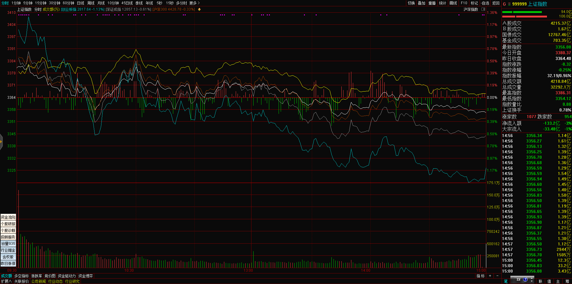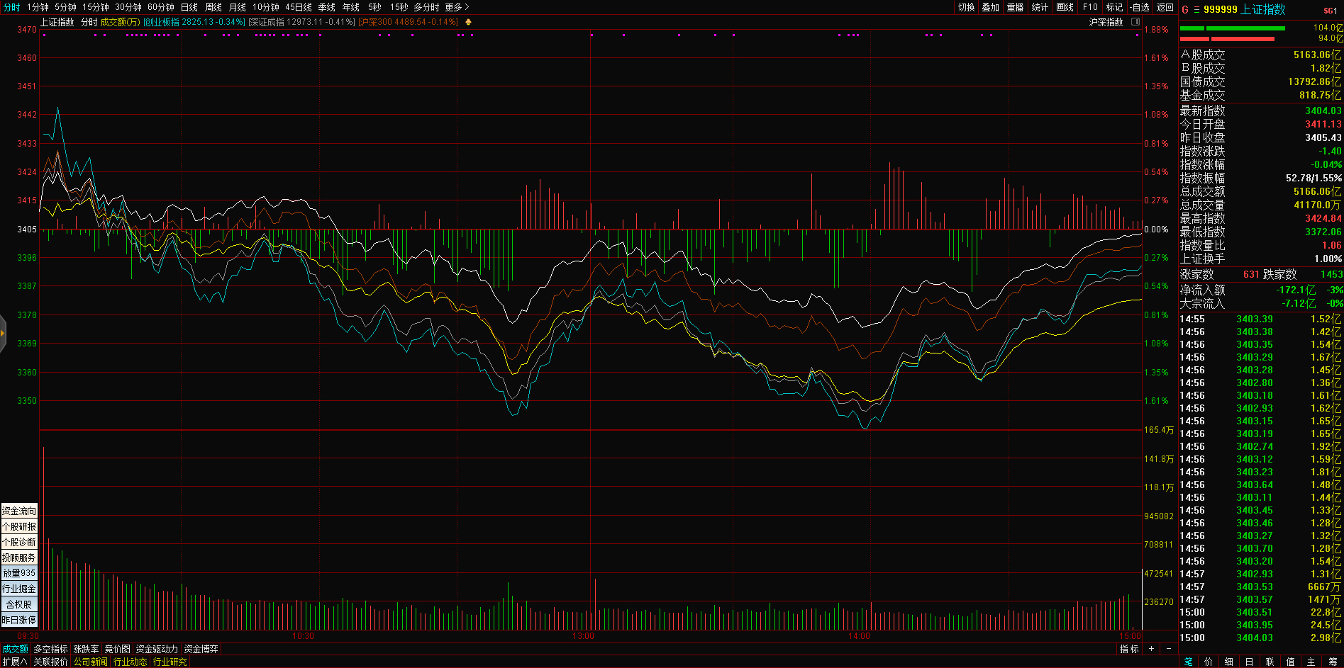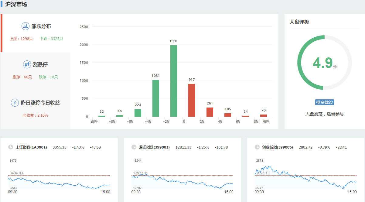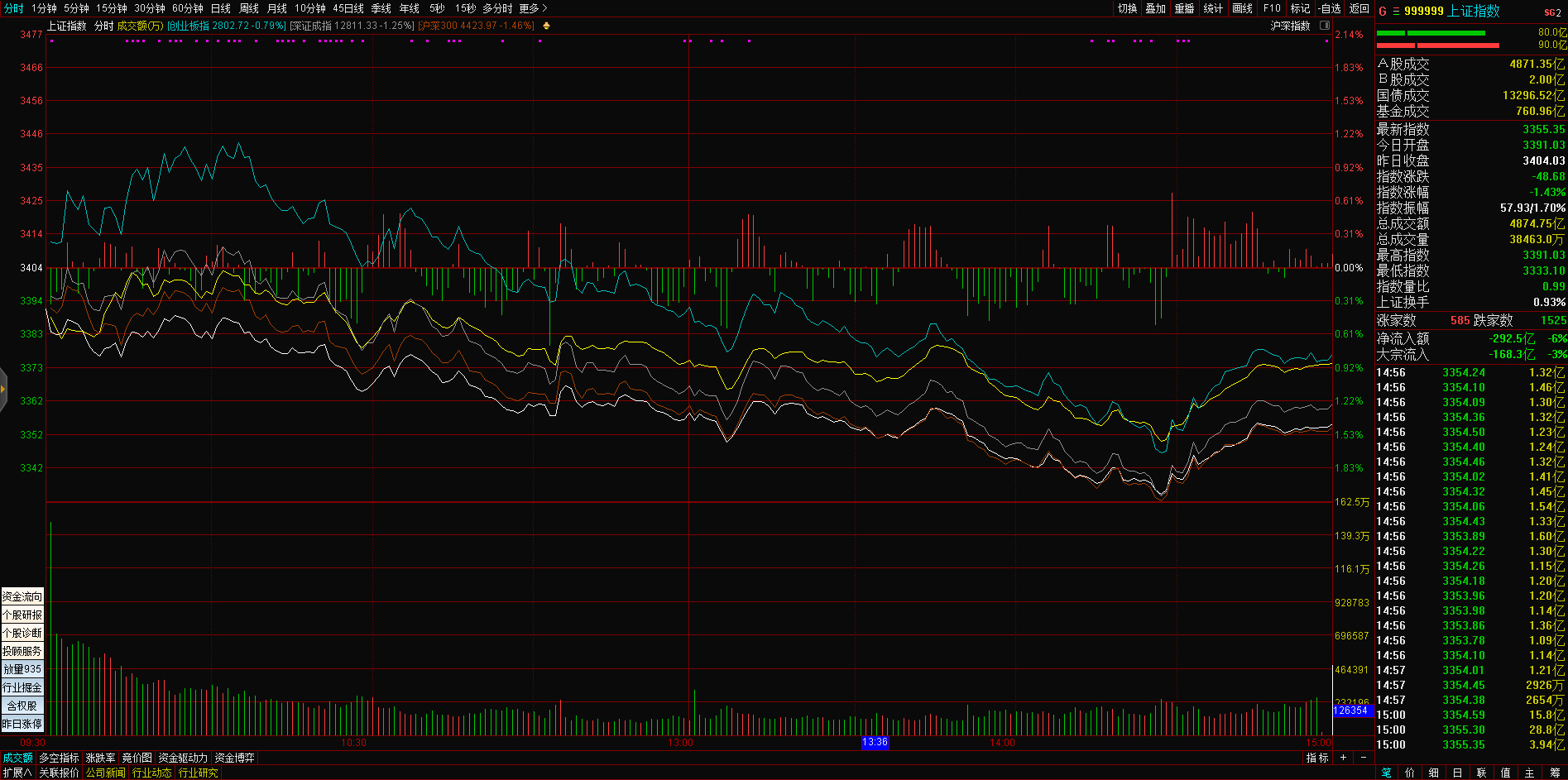导语: 三大指数午后震荡走弱,截至收盘,沪指跌0.25%,深成指跌0.61%,创业板指跌1.13%,沪深两市全天成交额10296亿元。智能音箱、元宇宙、智能交通等板块涨幅居前,钒电池、磷化工等板块飘绿。两市超2500只个股上涨,北向资金全天净买入12.36亿元。盘面上,元宇宙概念涨幅居前,国光电器、宝鹰股份、智度股份涨停,长信科技、蓝思科技跟涨,消息面上,上海市人民政府办公厅发布关于印发促进绿色低碳产业发展、培育“元宇宙”新赛道、促进智能终端产业高质量发展等行动方案的通知。钒电池概念下跌,攀钢钒钛跌停,易成新能、金浦钛业、银龙股份、新天绿能等纷纷大幅走低。