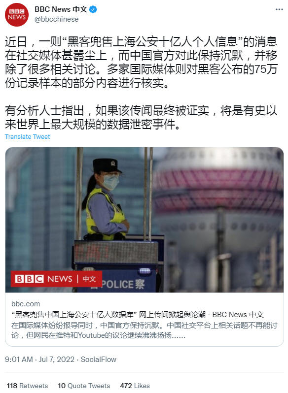 “黑客兜售中国上海公安十亿人数据库” 网上传闻掀起舆论潮