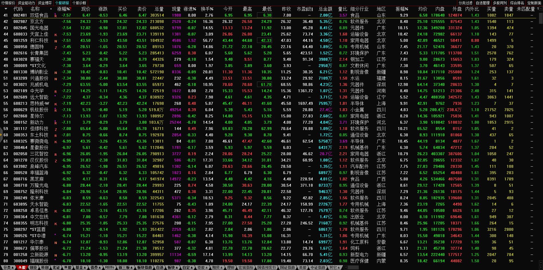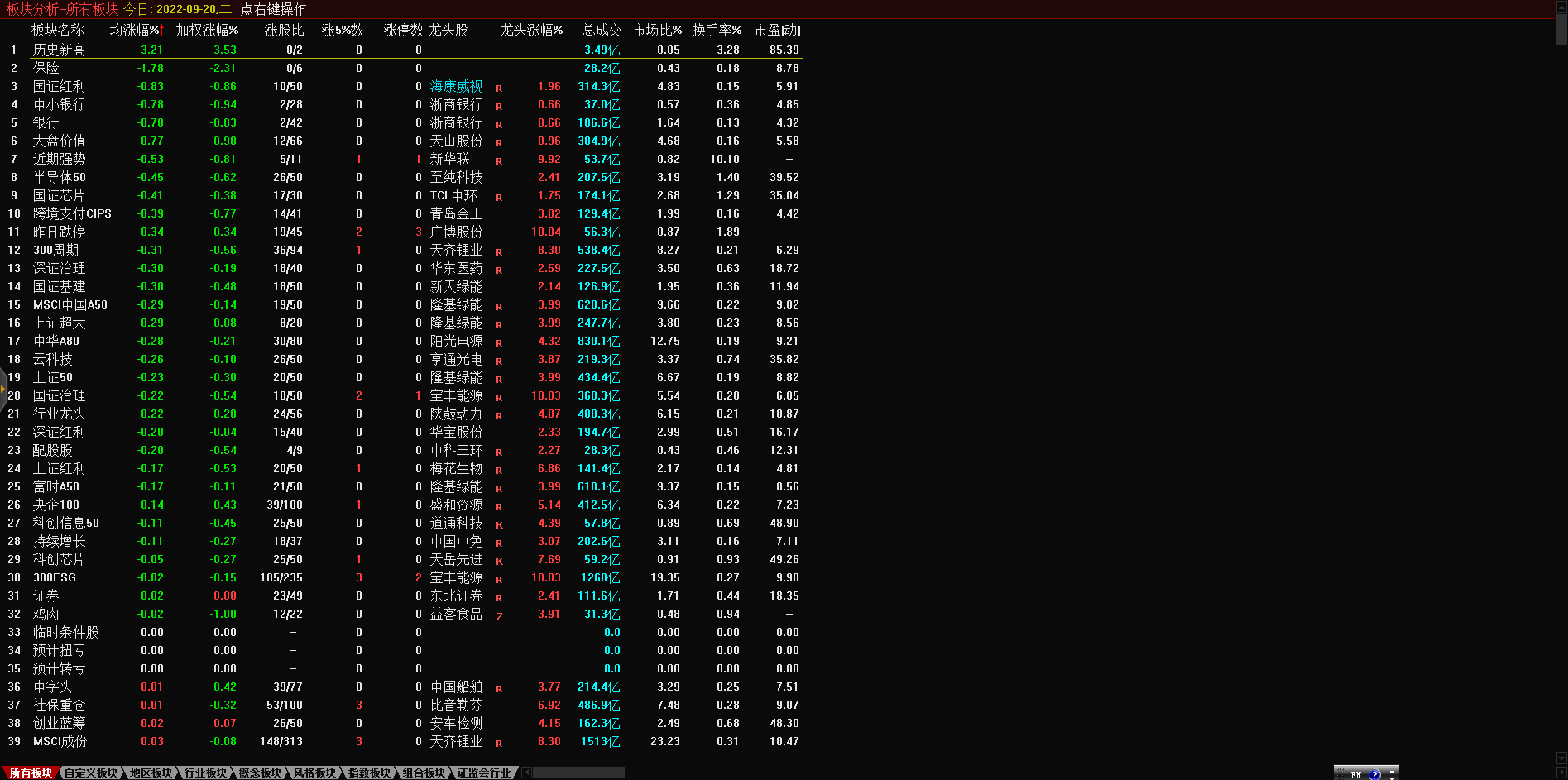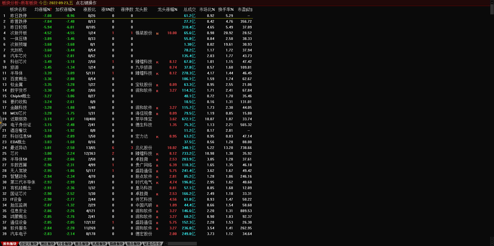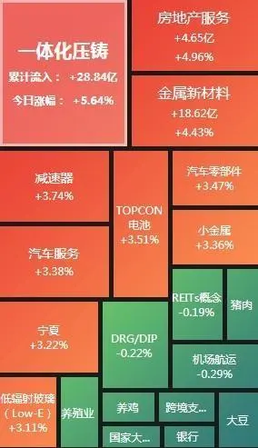 盘面上,大金融板块全天护盘,中国银河(601881)午后一度涨超8%,东兴证券、杭州银行(600926)、民生控股(000416)、中信银行、广发证券、国信证券、中信建投(601066)等跟涨。饮料制造板块涨幅居前,百润股份(002568)涨超6%,今世缘(603369)、重庆啤酒(600132)、青岛啤酒(600600)、洋河股份(002304)等跟涨。装配式建筑板块涨幅居前,建艺集团(002789)、东易日盛(002713)、全筑股份(603030)涨停,杭州园林(300649)、中国建筑、福星股份(000926)、郑中设计(002811)、中天精装(002989)等跟涨,消息上,发改委昨日在新闻发布会上表示,我国新能源产业全球领先,为全球市场提供超过70%的光伏组件;绿色建筑占当年城镇新建建筑面积比例提升至84%。汽车芯片、半导体板块领跌两市,斯达半导(603290)跌停,则成电子跌超11%,佳缘科技(301117)、钜泉科技、赛微微电、大港股份(002077)、东微半导、国芯科技、创耀科技、东尼电子(603595)、士兰微(600460)、北方华创(002371)等跟跌。一体化压铸板块跌幅居前,长华集团(605018)接近跌停,泉峰汽车(603982)、合力科技(603917)、云海金属(002182)、瑞鹄模具(002997)、旭升股份(603305)等多股跌超4%。数据安全板块跌幅居前,海量数据(603138)、京北方(002987)跌超7%,汇纳科技(300609)、天融信(002212)、南天信息(000948)等跟跌。