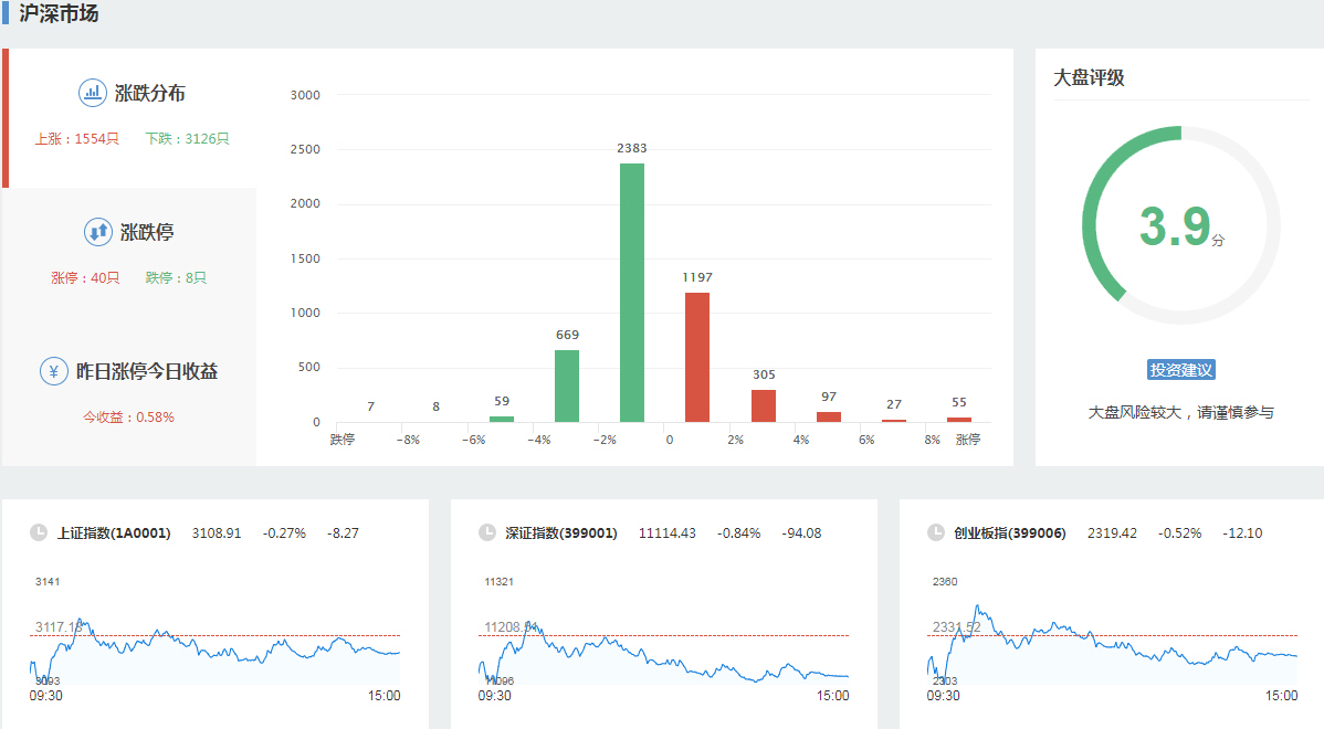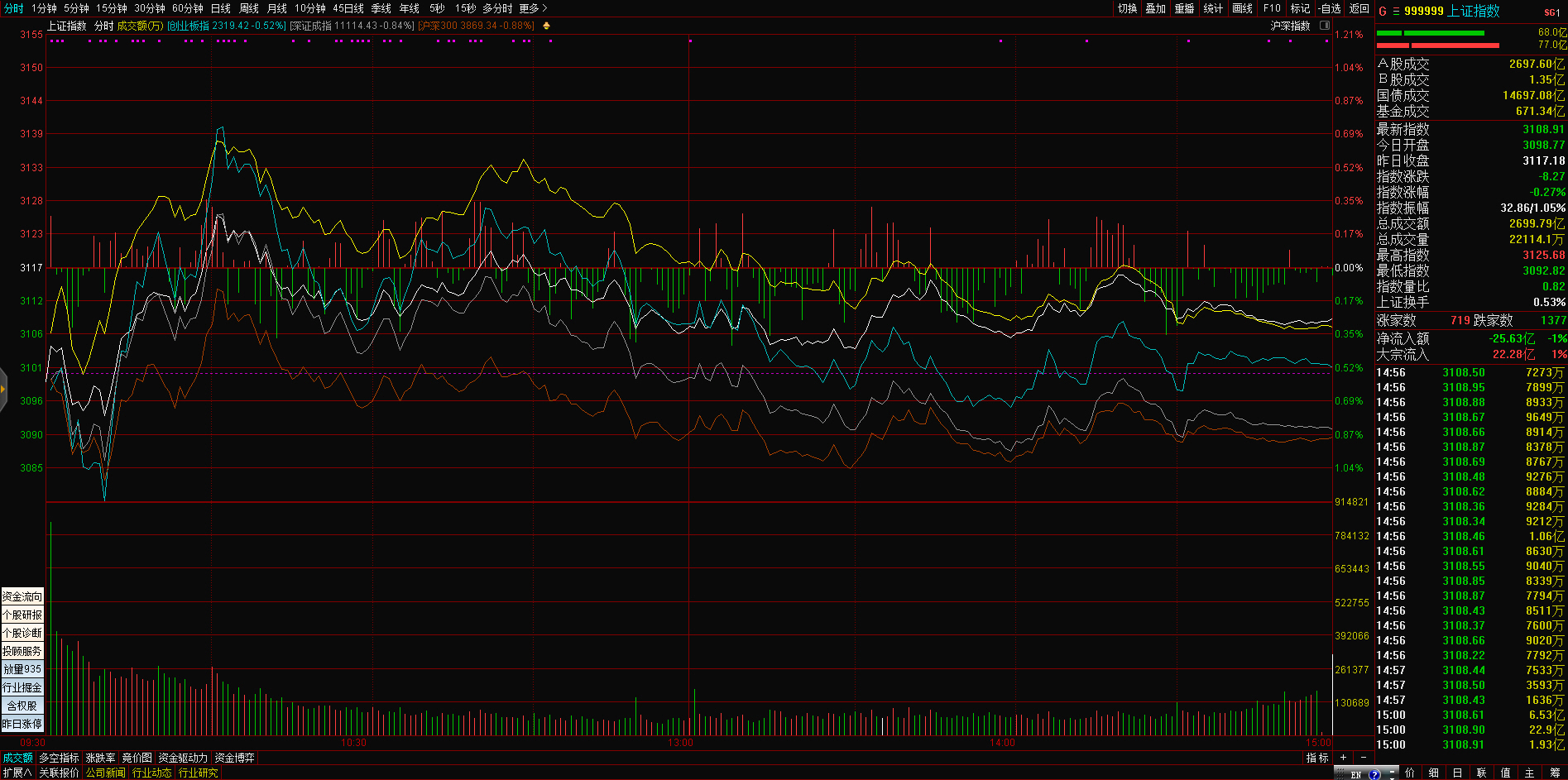 导语: 三大指数全天大幅震荡下跌,截至收盘,沪指跌0.66%,失守3100点,深成指跌0.97%,创业板指跌0.67%,沪深两市全天成交额6675亿元。大金融、饮料制造等板块护盘,一体化压铸、钛白粉、半导体等板块领跌两市。两市超4200股下跌,北向资金全天净卖出5.05亿元。盘面上,大金融板块全天护盘,中国银河午后一度涨超8%,东兴证券、杭州银行、民生控股、中信银行、广发证券、国信证券、中信建投等跟涨。饮料制造板块涨幅居前,百润股份涨超6%,今世缘、重庆啤酒、青岛啤酒、洋河股份等跟涨。装配式建筑板块涨幅居前,建艺集团、东易日盛、全筑股份涨停,杭州园林、中国建筑、福星股份、郑中设计、中天精装等跟涨,消息上,发改委昨日在新闻发布会上表示,我国新能源产业全球领先,为全球市场提供超过70%的光伏组件;绿色建筑占当年城镇新建建筑面积比例提升至84%。汽车芯片、半导体板块领跌两市,斯达半导跌停,则成电子跌超11%,佳缘科技、钜泉科技、赛微微电、大港股份、东微半导、国芯科技、创耀科技、东尼电子、士兰微、北方华创等跟跌。一体化压铸板块跌幅居前,长华集团接近跌停,泉峰汽车、合力科技、云海金属、瑞鹄模具、旭升股份等多股跌超4%。数据安全板块跌幅居前,海量数据、京北方跌超7%,汇纳科技、天融信、南天信息等跟跌。
