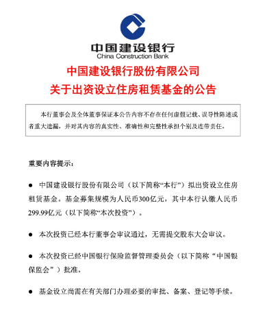 认缴299.99亿元!建设银行拟出资设立住房租赁基金