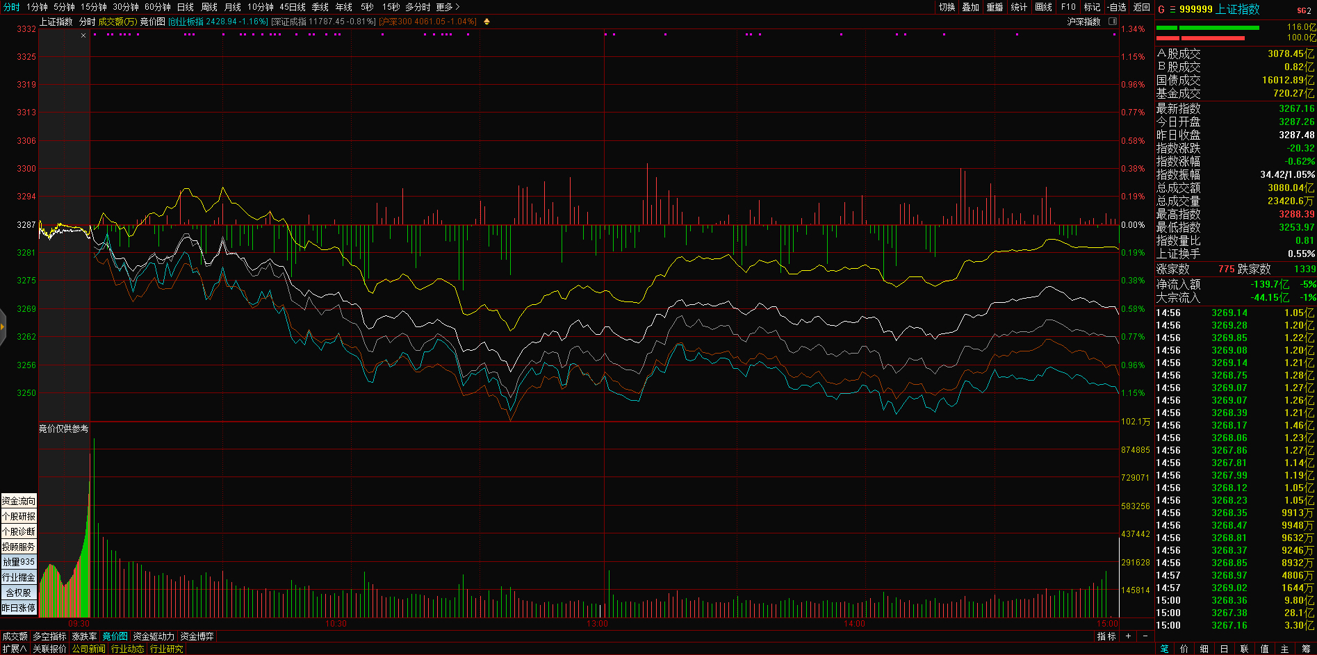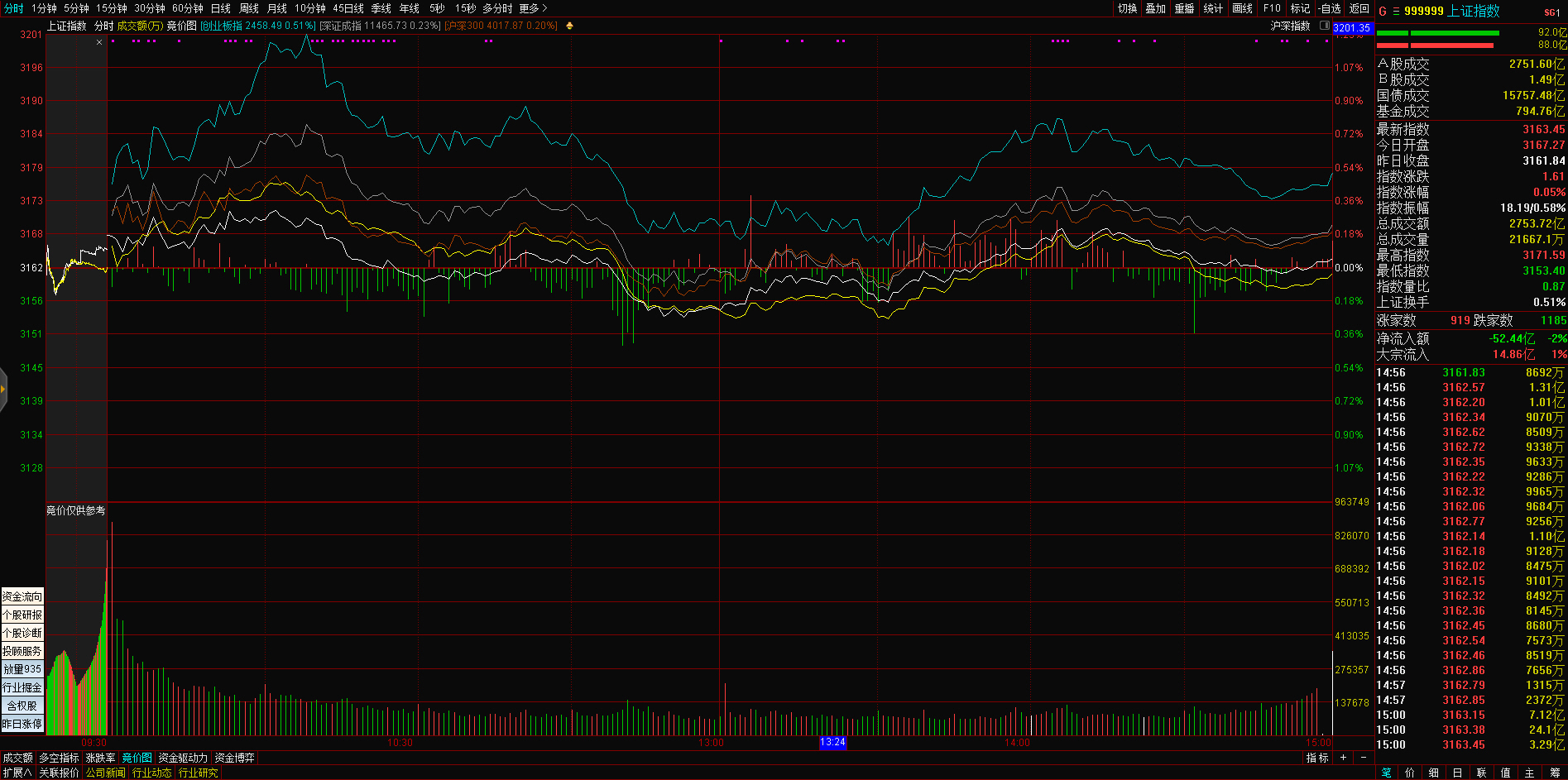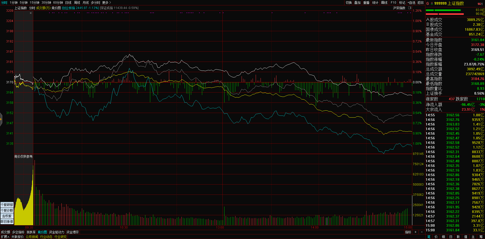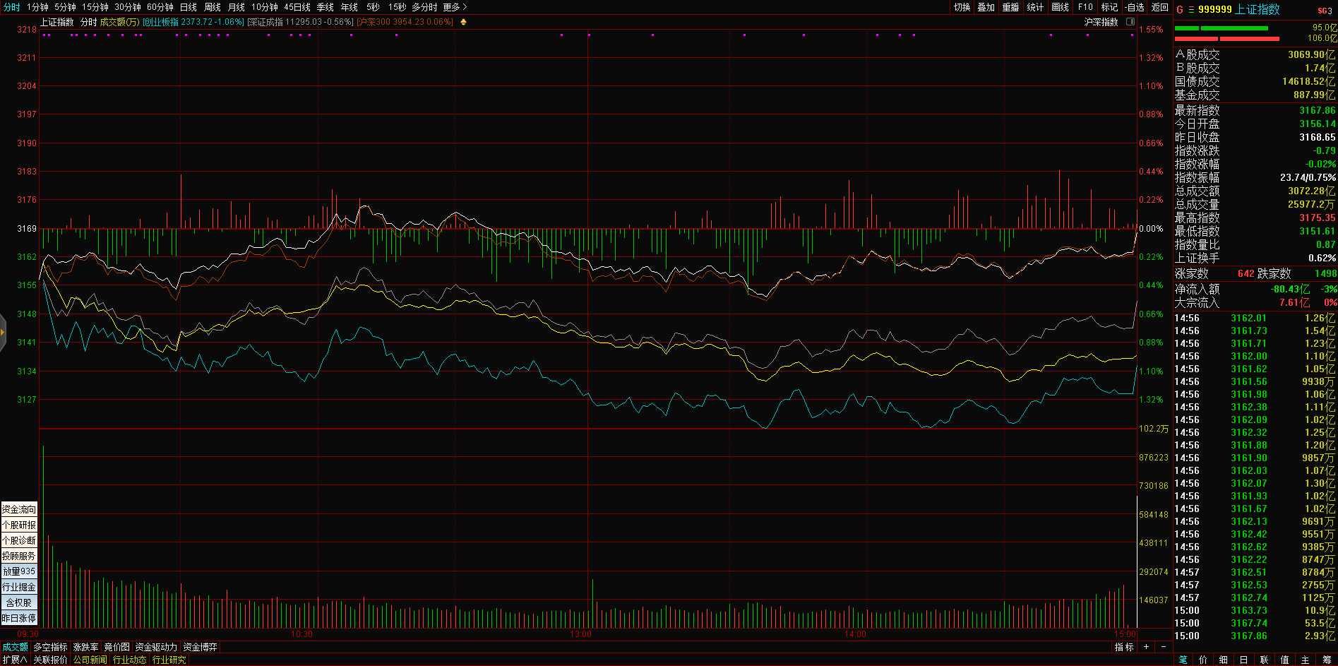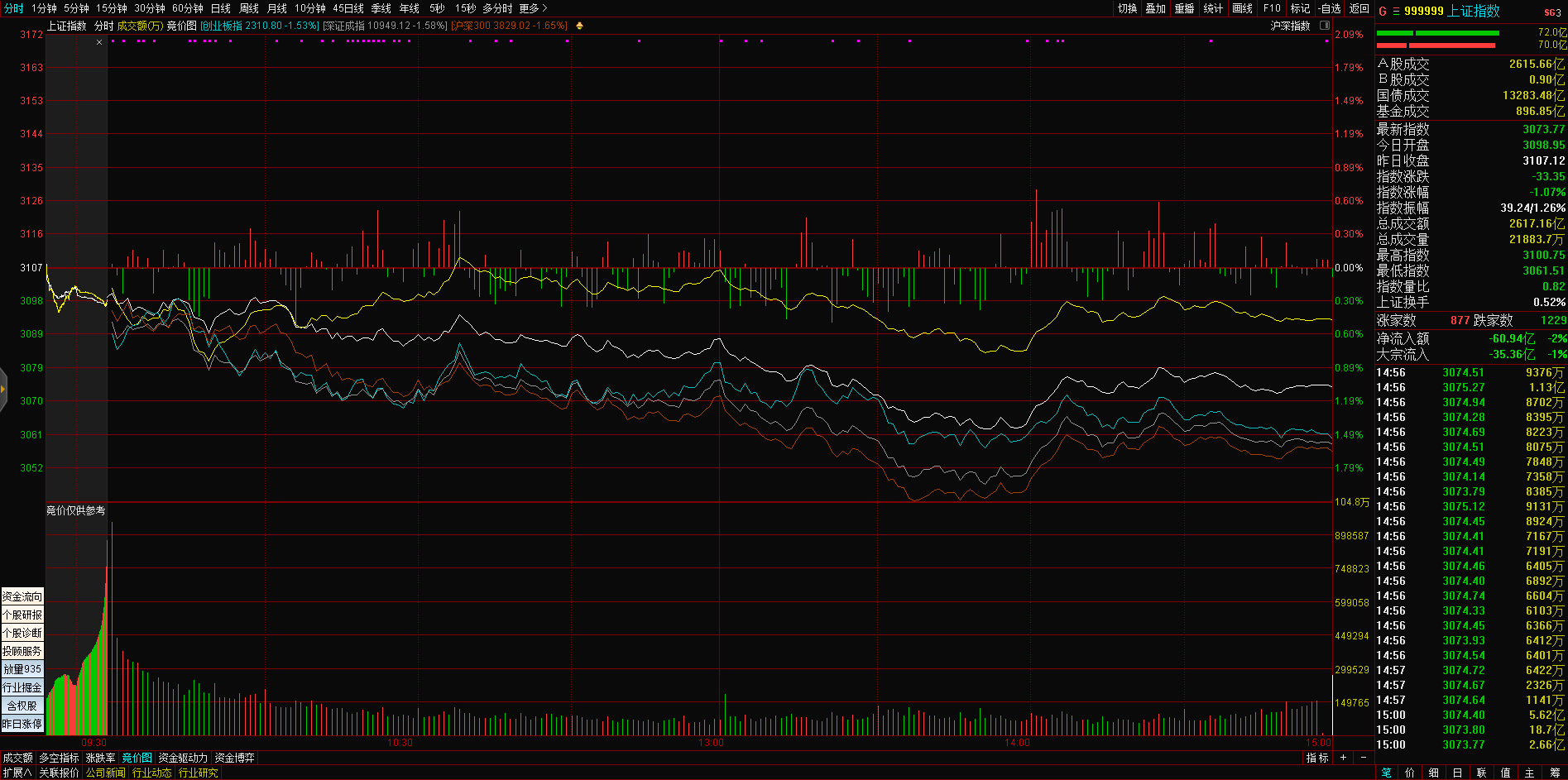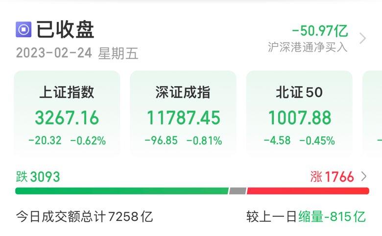 指数午后低位震荡,截至收盘,沪指跌0.62%,深成指跌0.81%,创业板指跌1.16%,北证50跌0.52%。算力、军工领涨,汽车产业链、消费、证券领跌。两市近3100只个股下跌,全天成交额仅7258亿元,较昨日缩量815亿元,北向资金净卖出51亿元。