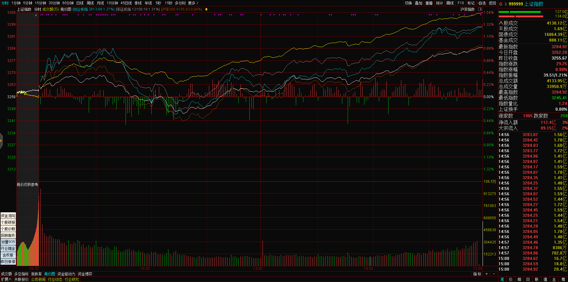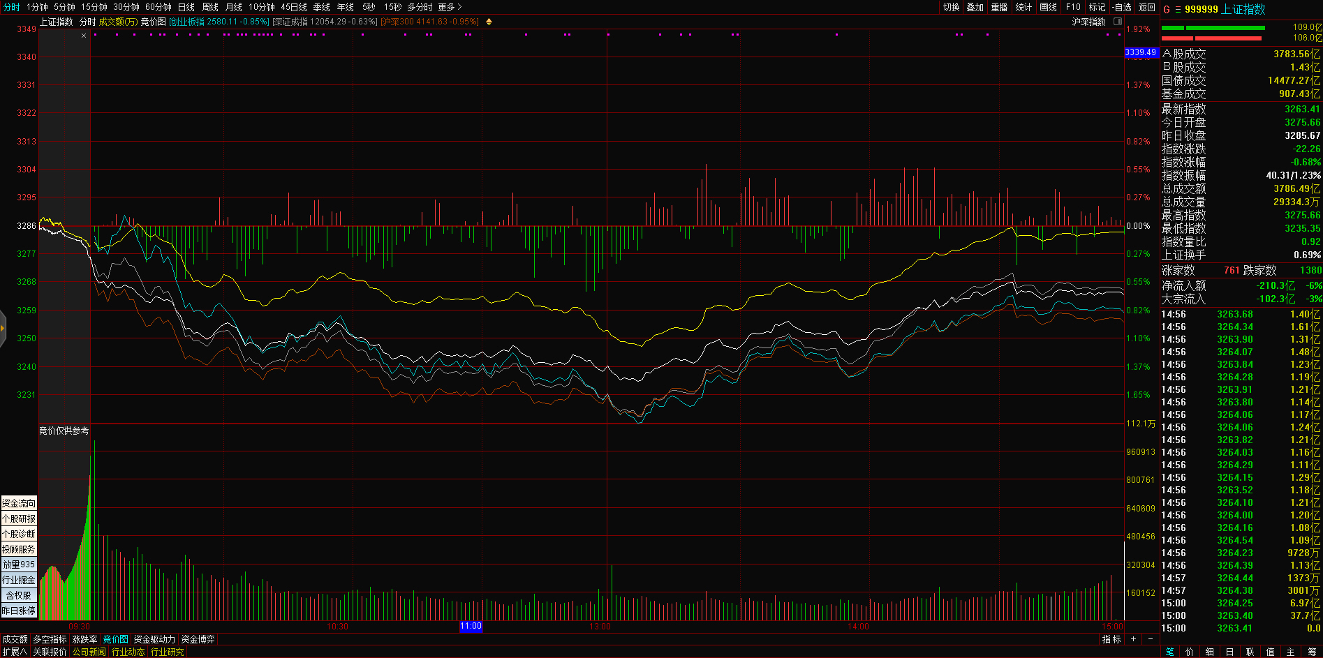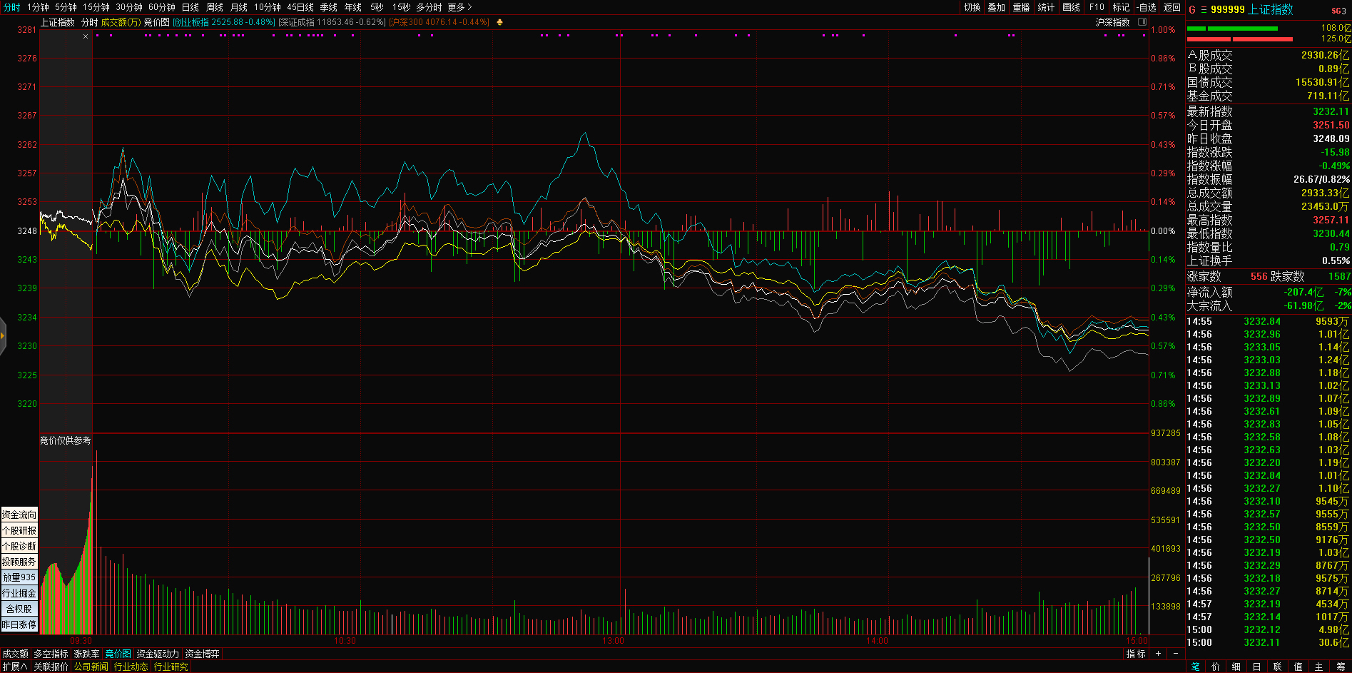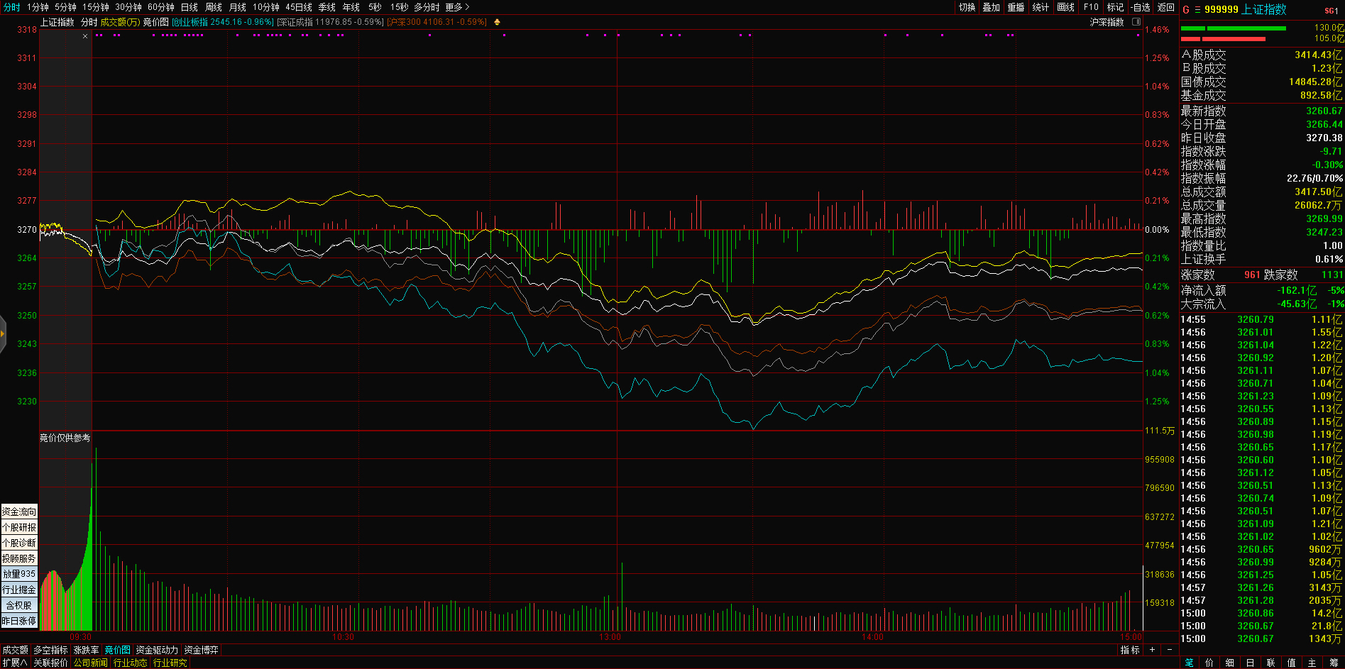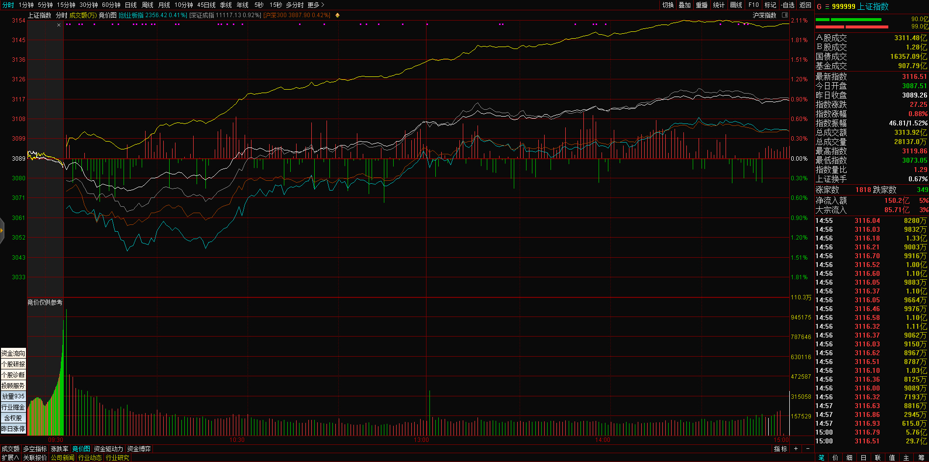 指数午后低位震荡,截至收盘,沪指跌0.62%,深成指跌0.81%,创业板指跌1.16%,北证50跌0.52%。算力、军工领涨,汽车产业链、消费、证券领跌。两市近3100只个股下跌,全天成交额仅7258亿元,较昨日缩量815亿元,北向资金净卖出51亿元。