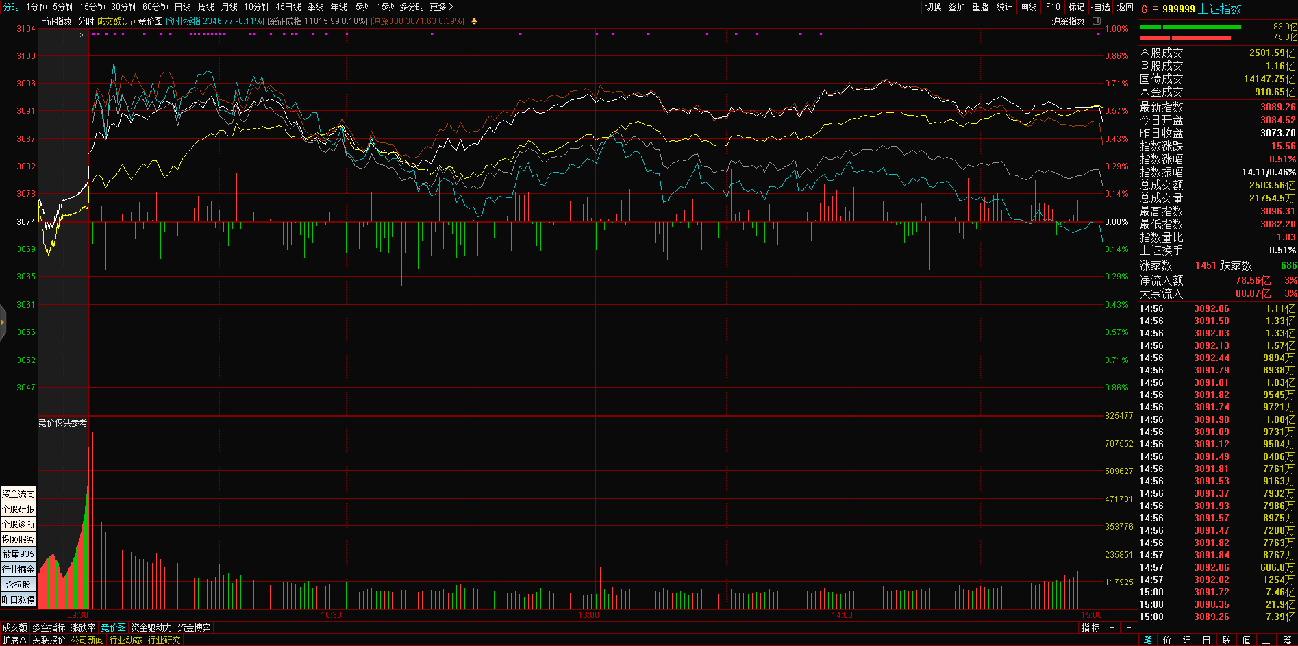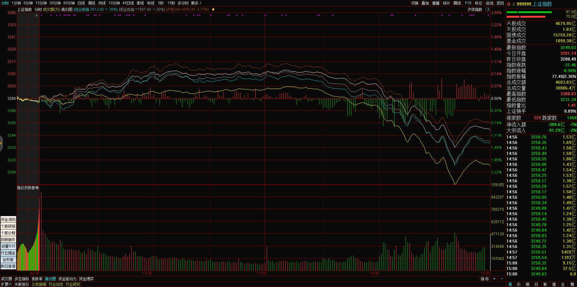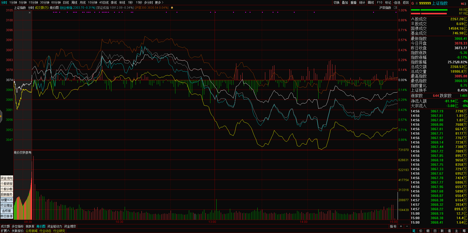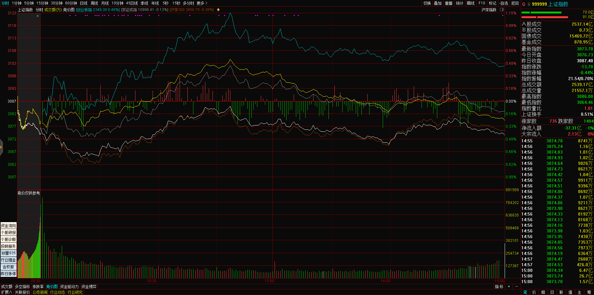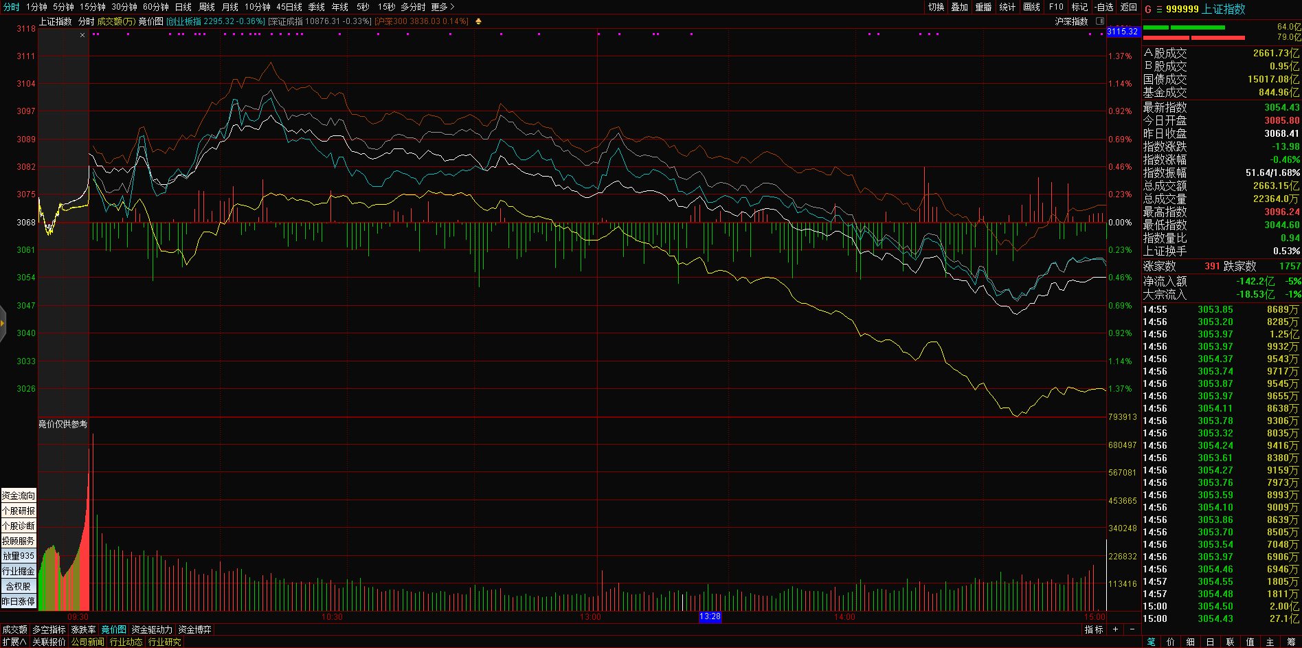指数午后低位震荡,截至收盘,沪指跌0.62%,深成指跌0.81%,创业板指跌1.16%,北证50跌0.52%。算力、军工领涨,汽车产业链、消费、证券领跌。两市近3100只个股下跌,全天成交额仅7258亿元,较昨日缩量815亿元,北向资金净卖出51亿元。