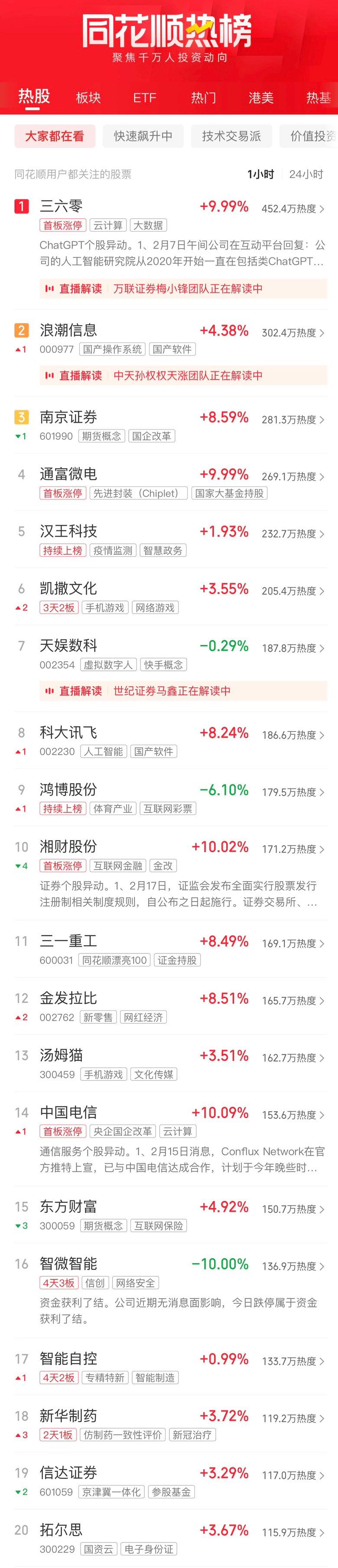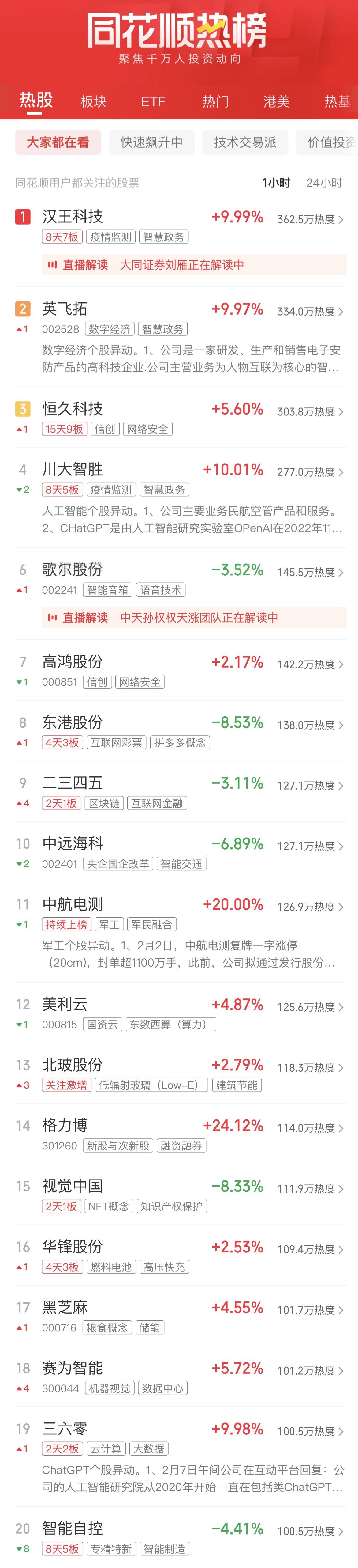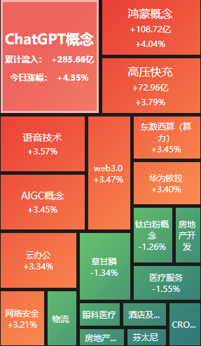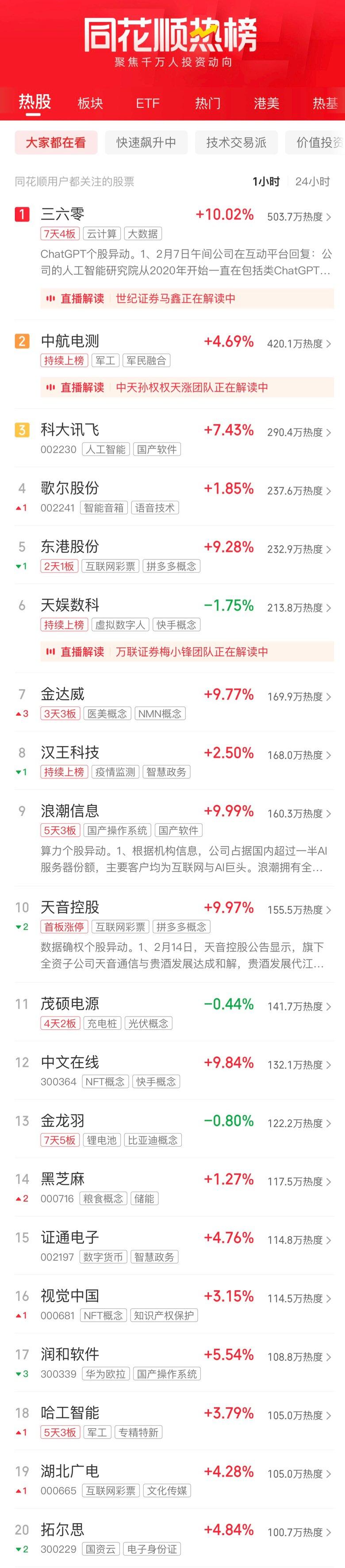 13:04 ChatGPT概念板块午后拉升,三六零(601360)涨近5%,拓尔思、多伦科技(603528)、海天瑞声、鸿博股份(002229)等跟涨。