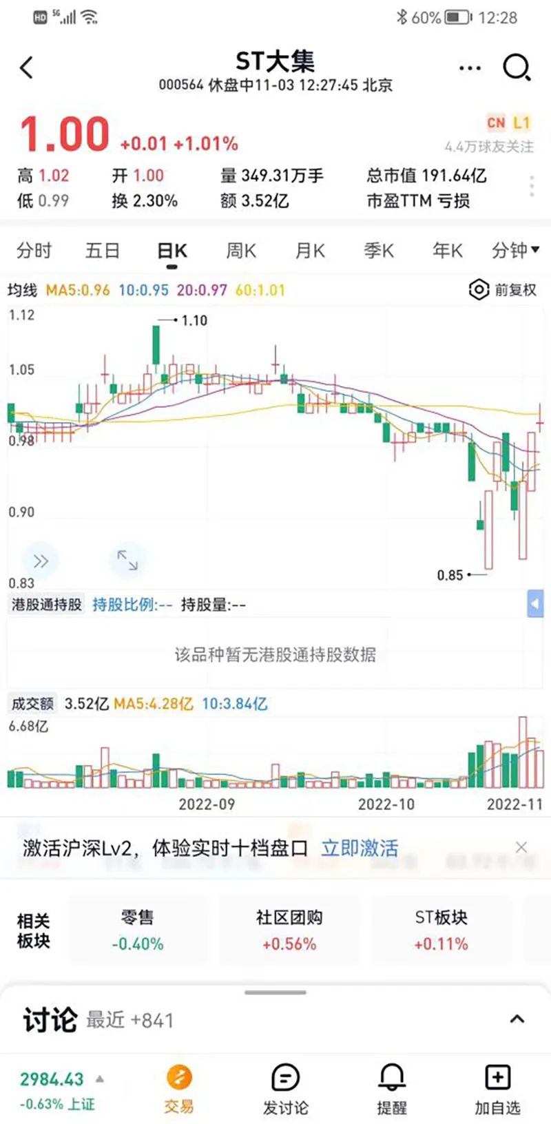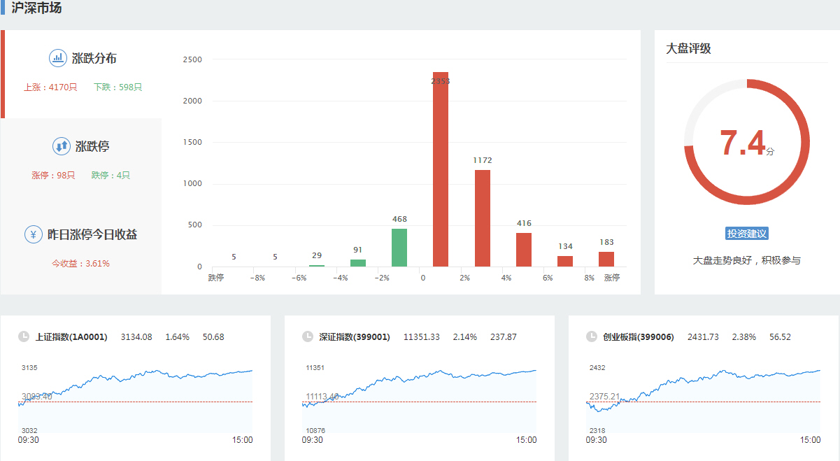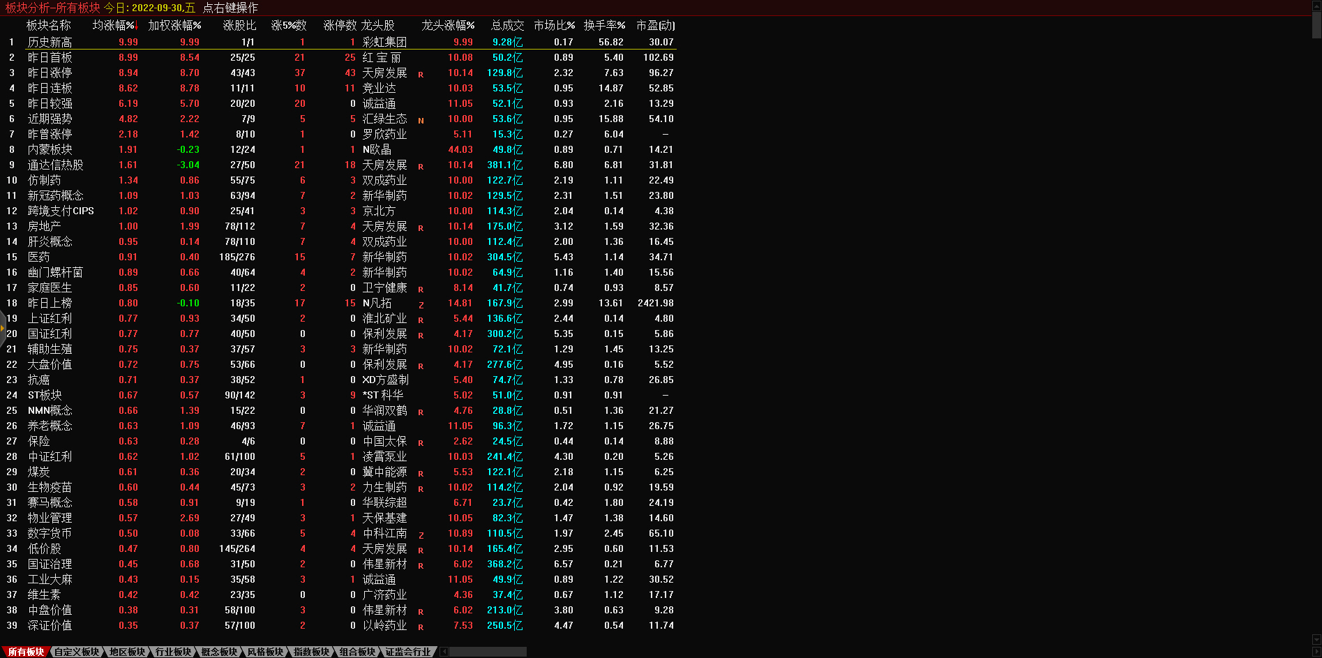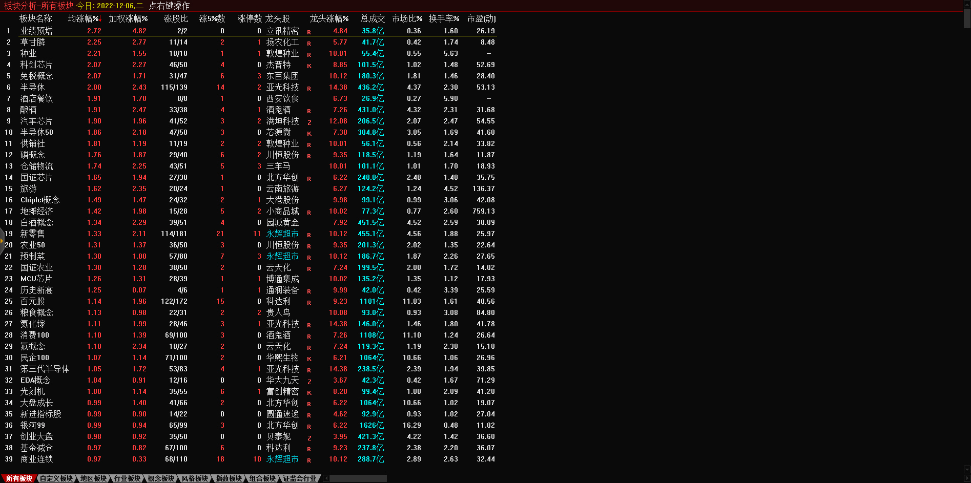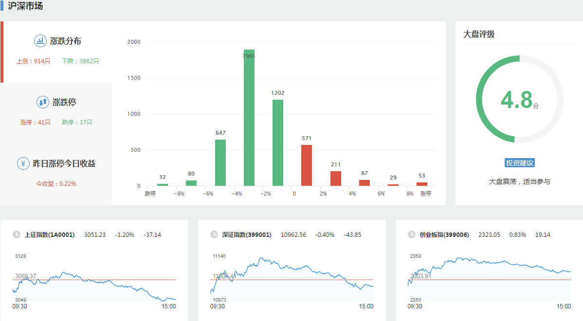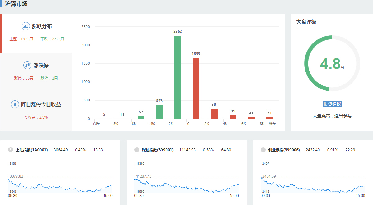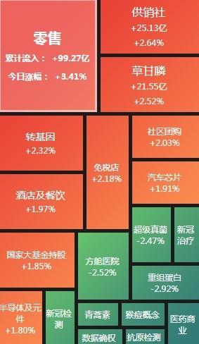 导语: 三大指数午后窄幅震荡,截至收盘,沪指涨0.02%,深成指涨0.67%,创业板指涨0.68%,沪深两市全天成交额9982亿元。两市超3200只个股下跌,北向资金全天净买入5.40亿元。板块题材上,零售板块领涨两市,半导体芯片股涨幅居前,供销社概念股尾盘拉升,医药商业、数据确权全天走低。盘面上,零售板块掀涨停潮,板块内永辉超市、东百集团、中百集团、三江购物、小商品城、深赛格、徐家汇等近10股涨停;芯片股涨幅居前,博通集成、大港股份先后涨停,满坤科技涨超10%;供销社概念股尾盘拉升,天鹅股份涨停,敦煌种业回封涨停,天禾股份、中农联合、浙农股份、辉隆股份等跟涨;医药商业板块全天领跌,嘉事堂、塞力医疗、一心堂齐跌停;今日连板高标股再现退潮,15天14板永顺泰上演“天地板”。