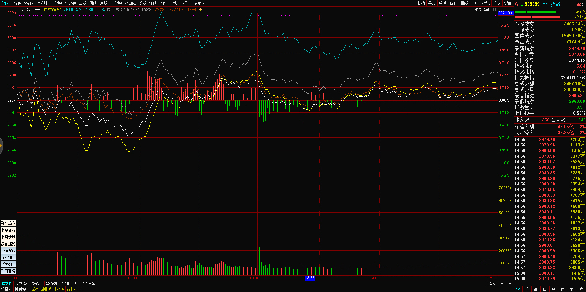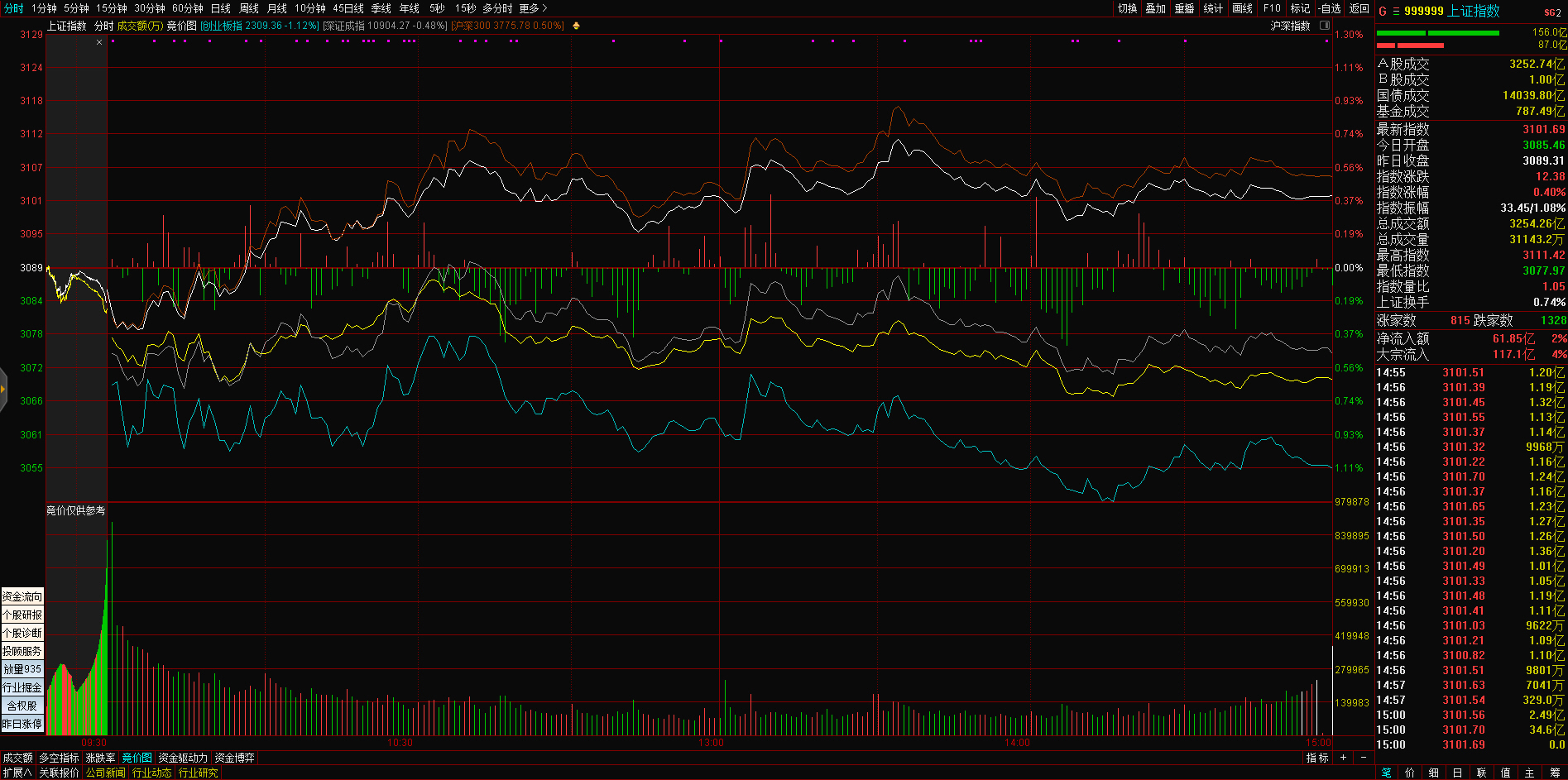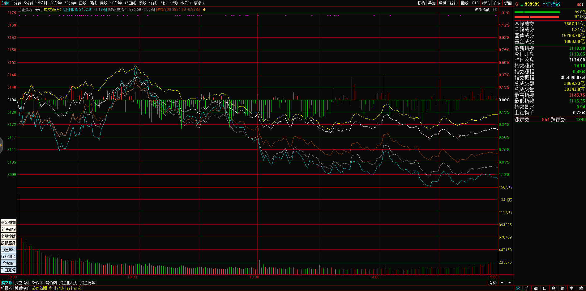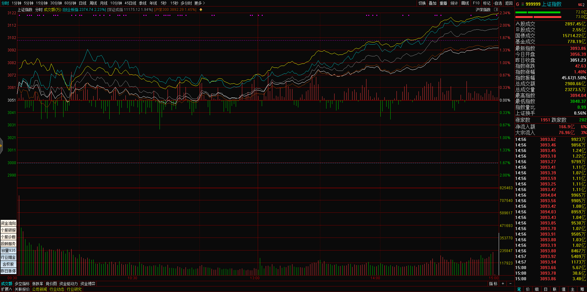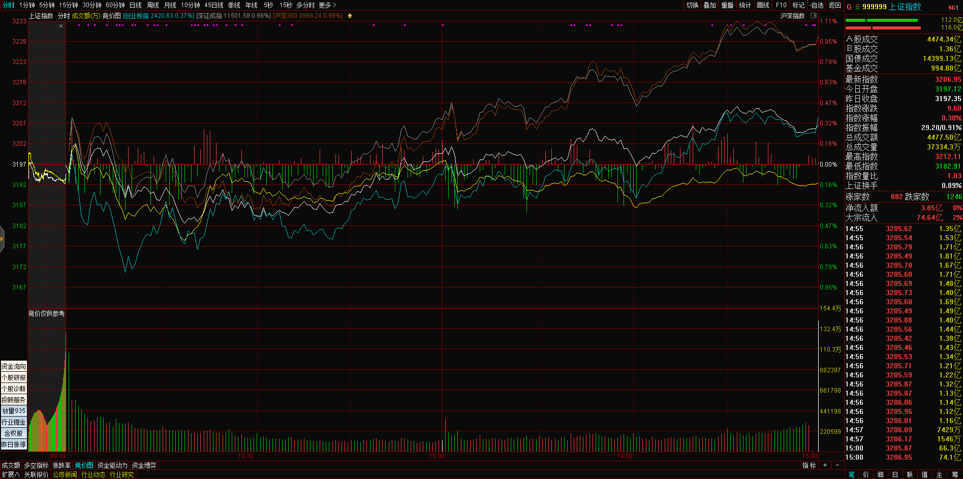 三大指数午后窄幅震荡,截至收盘,沪指涨0.02%,深成指涨0.67%,创业板指涨0.68%,沪深两市全天成交额9982亿元。两市超3200只个股下跌,北向资金全天净买入5.40亿元。