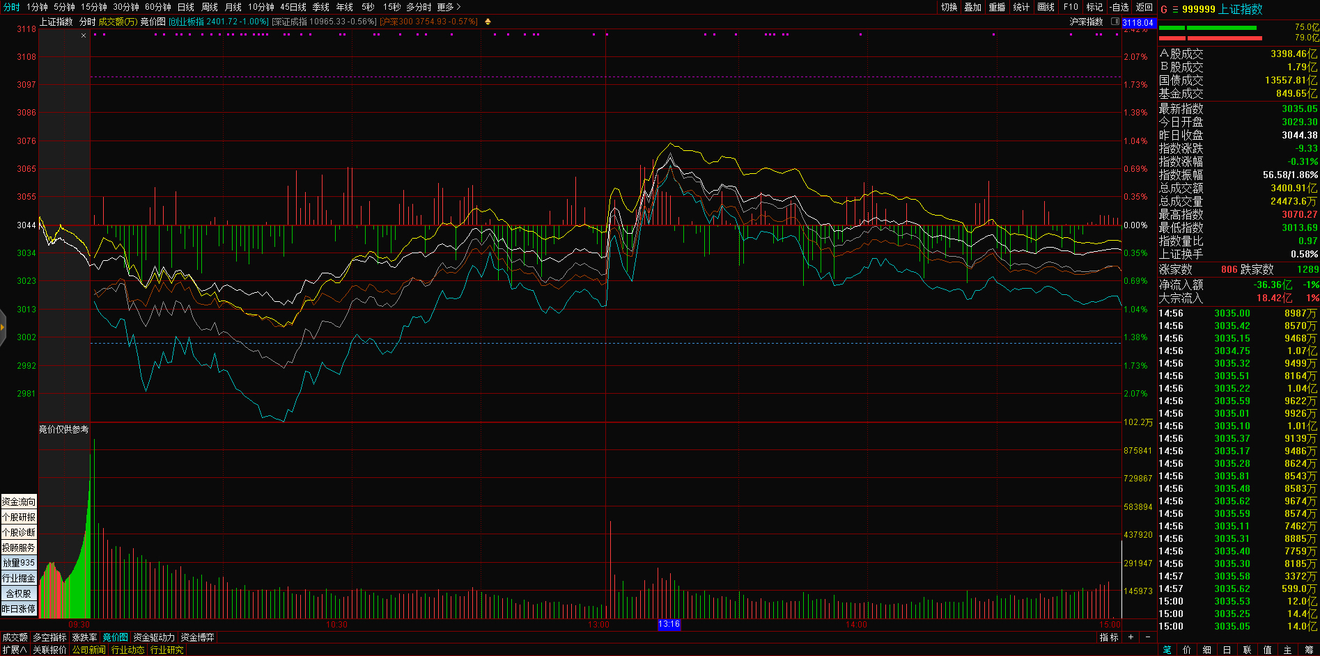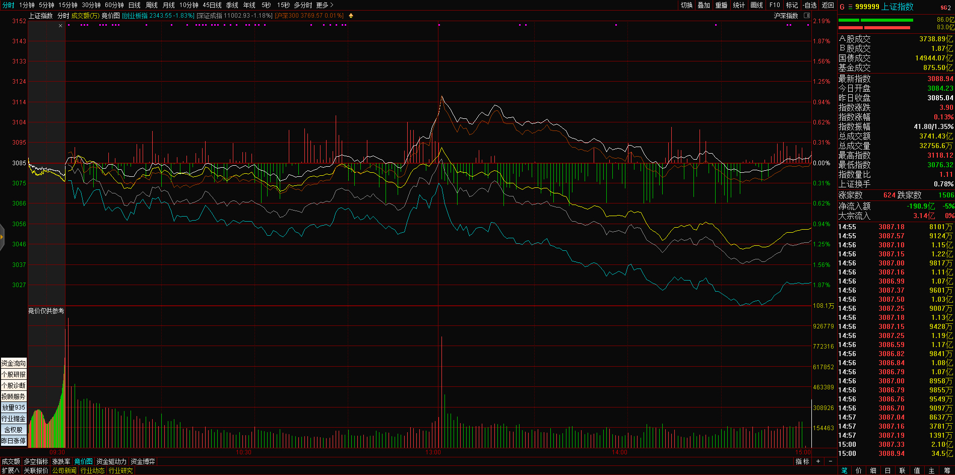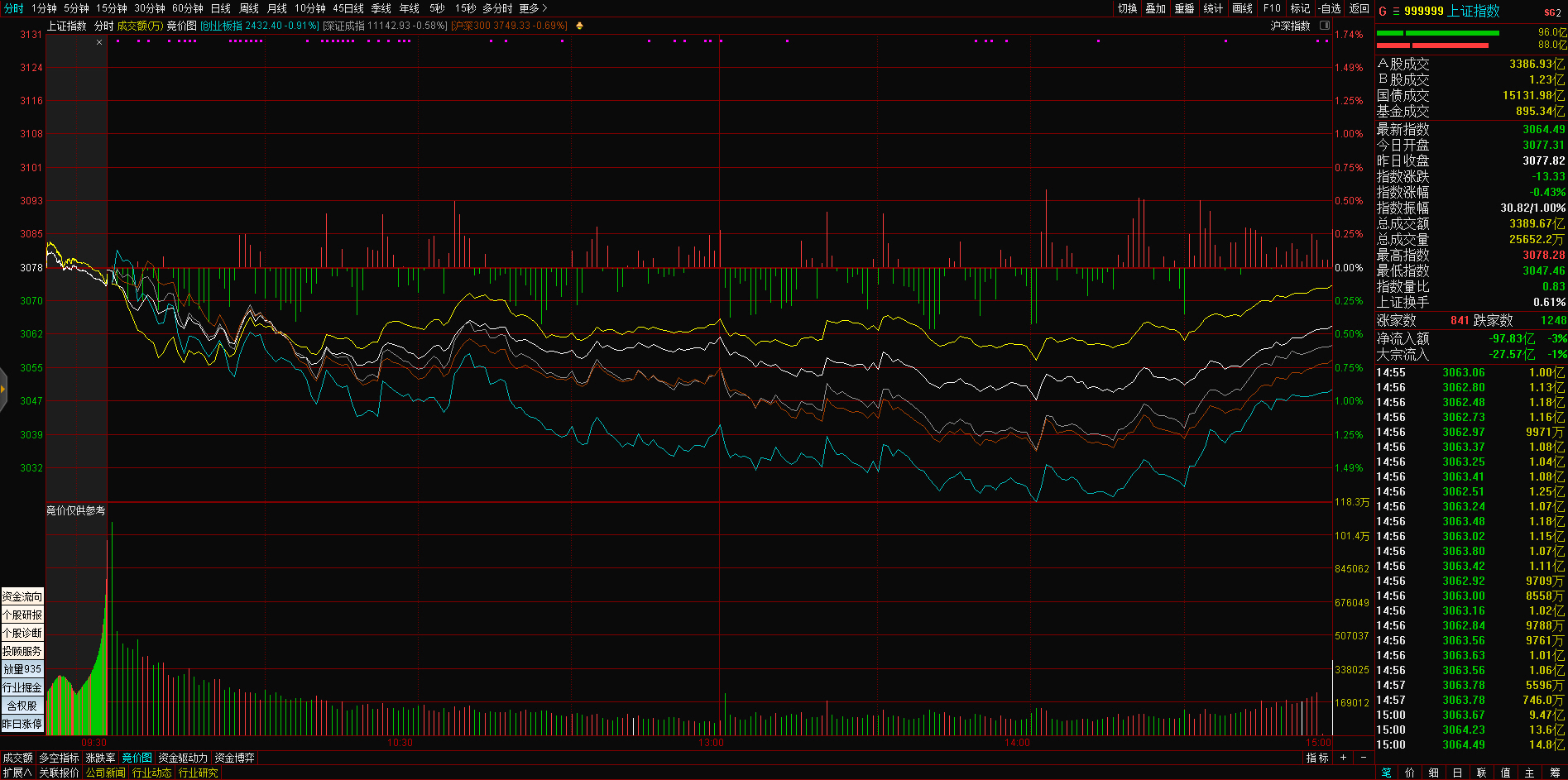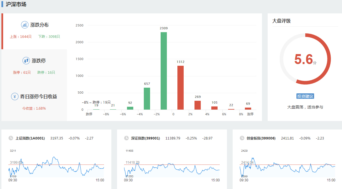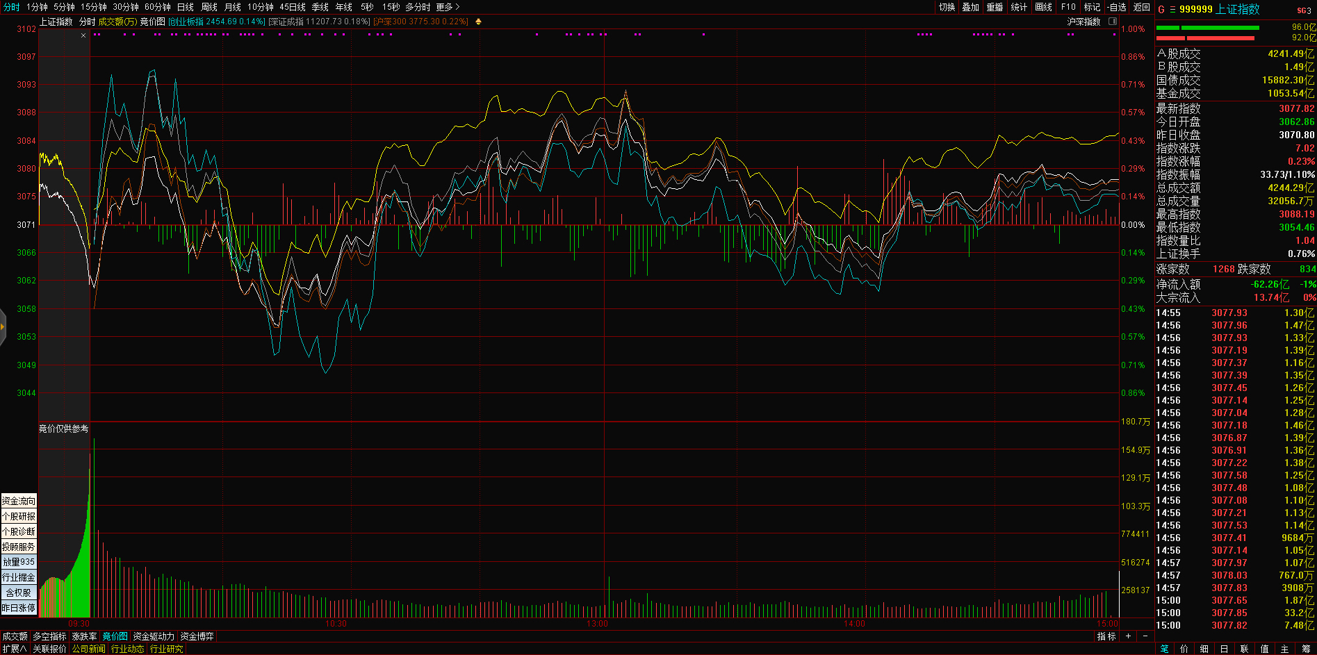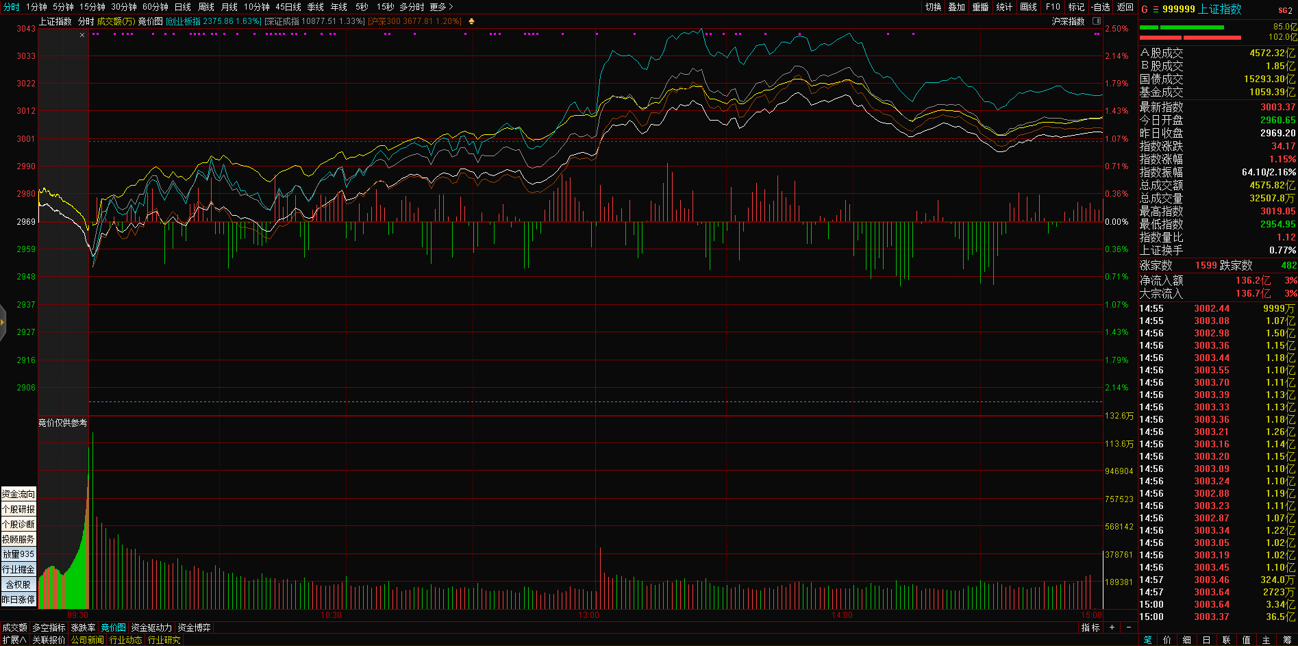 三大指数午后窄幅震荡,截至收盘,沪指涨0.02%,深成指涨0.67%,创业板指涨0.68%,沪深两市全天成交额9982亿元。两市超3200只个股下跌,北向资金全天净买入5.40亿元。