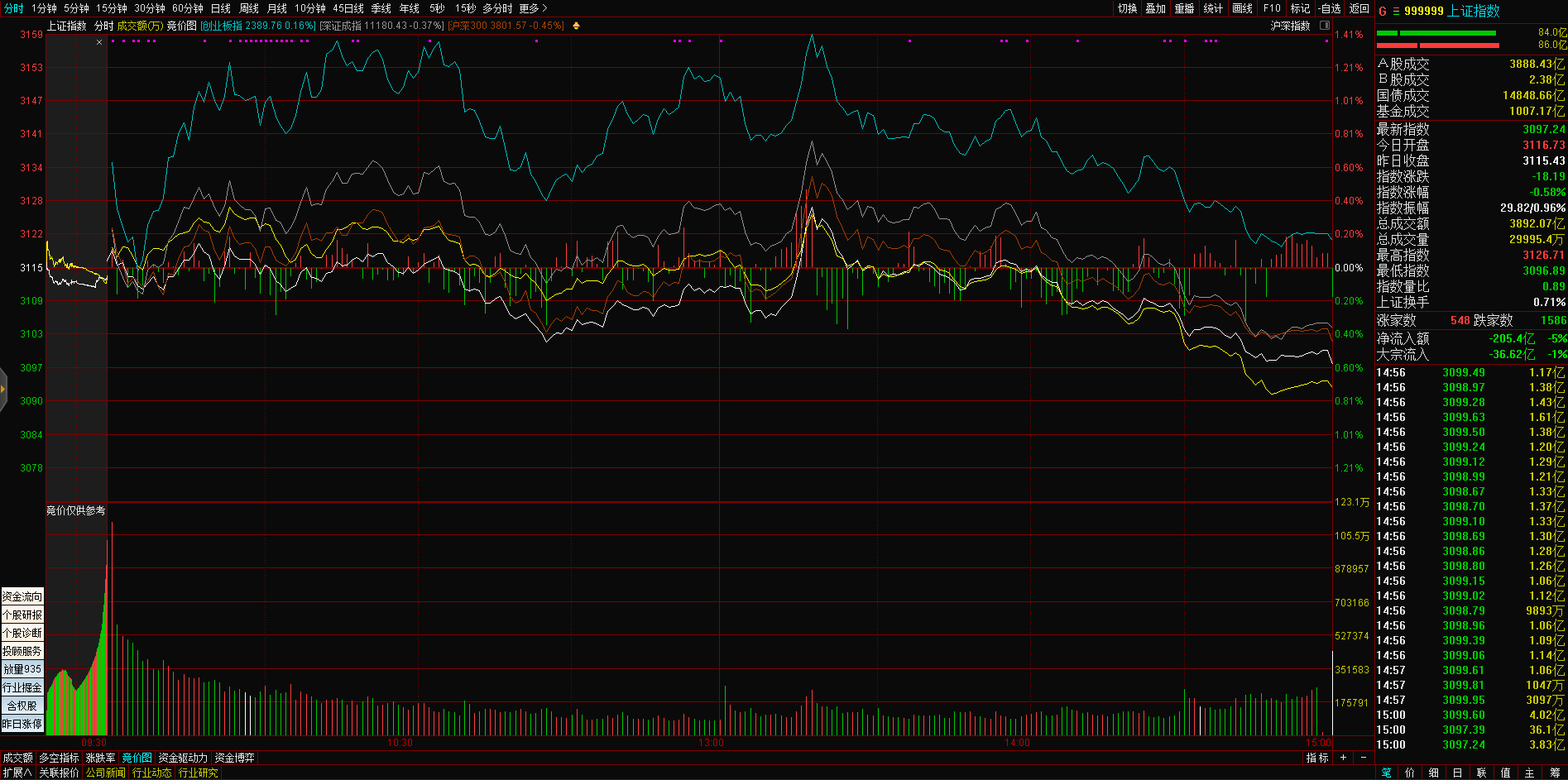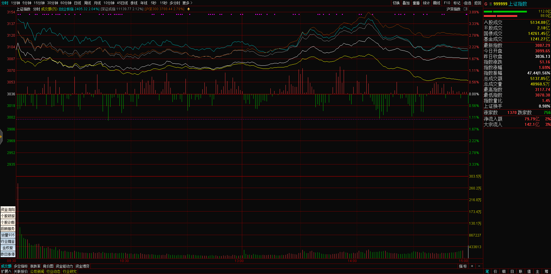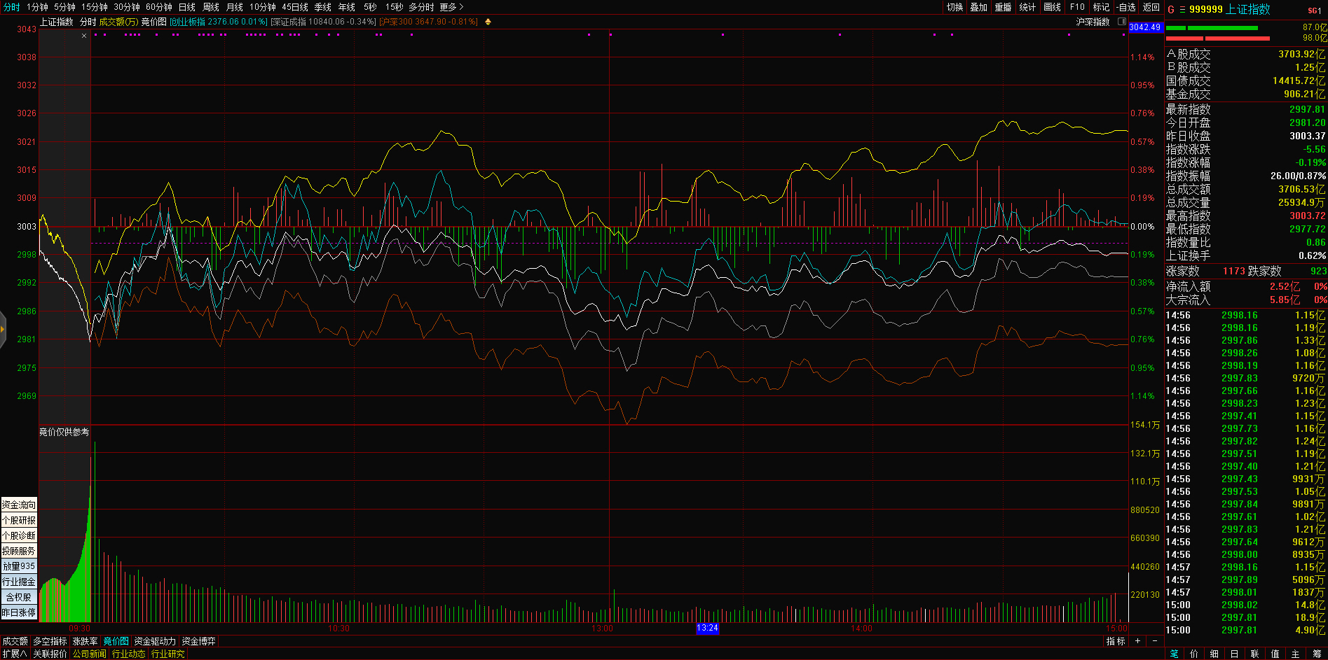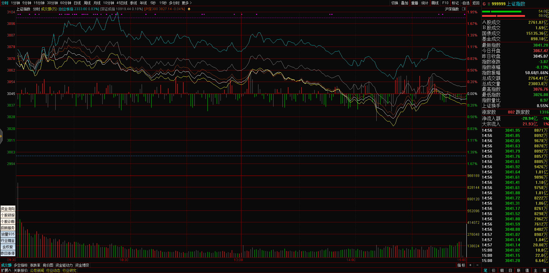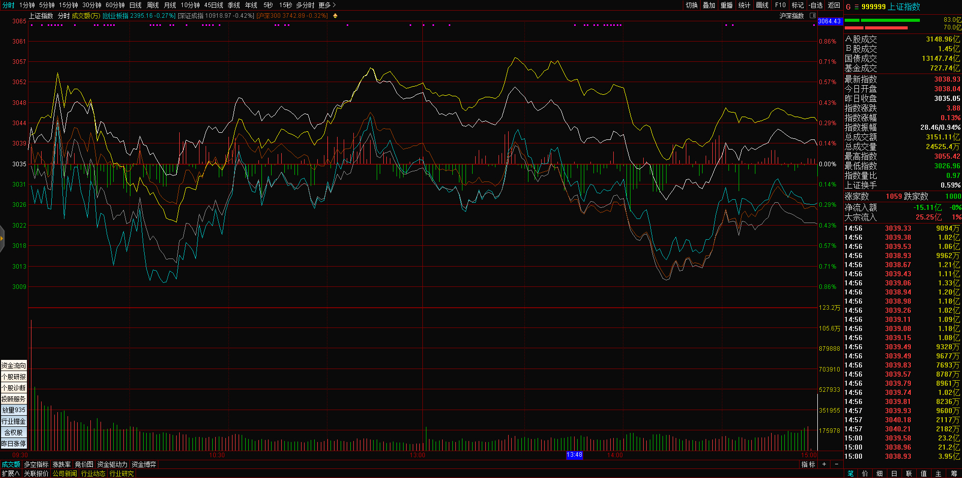 三大指数午后窄幅震荡,截至收盘,沪指涨0.02%,深成指涨0.67%,创业板指涨0.68%,沪深两市全天成交额9982亿元。两市超3200只个股下跌,北向资金全天净买入5.40亿元。