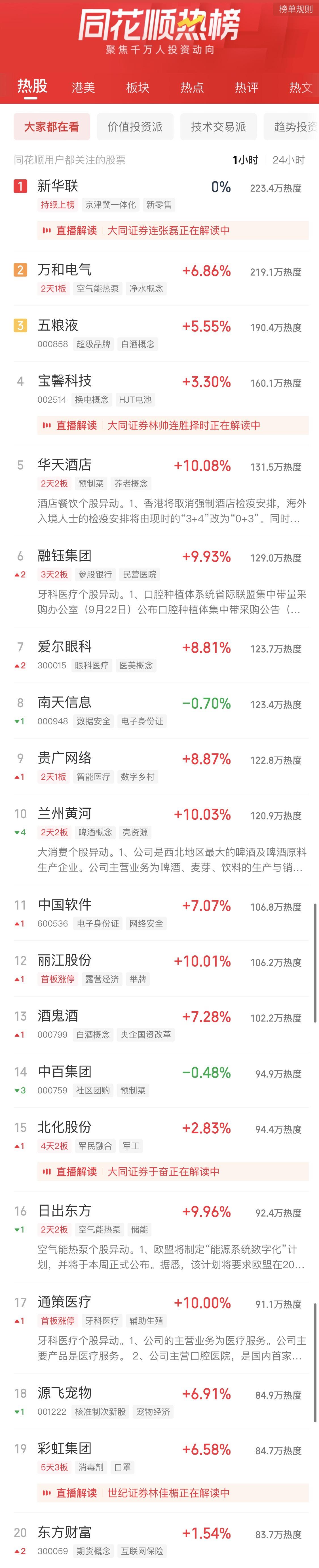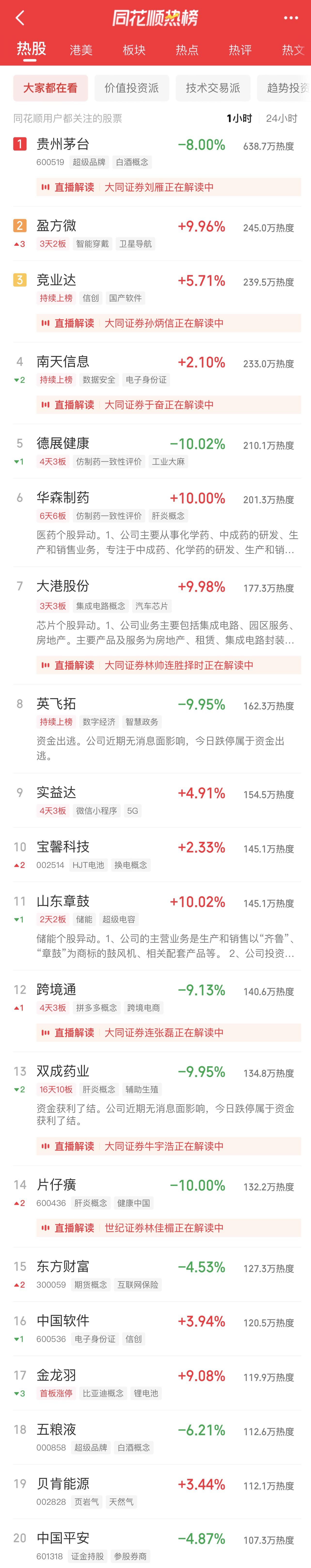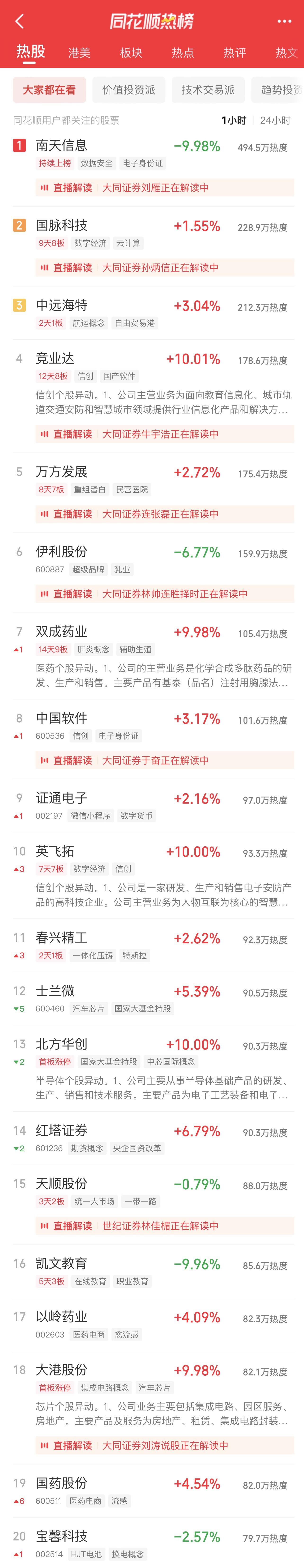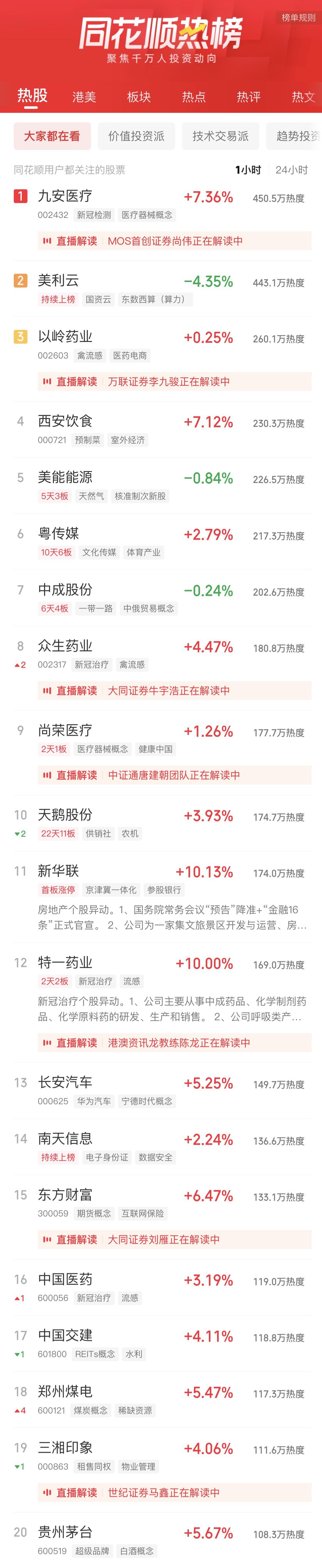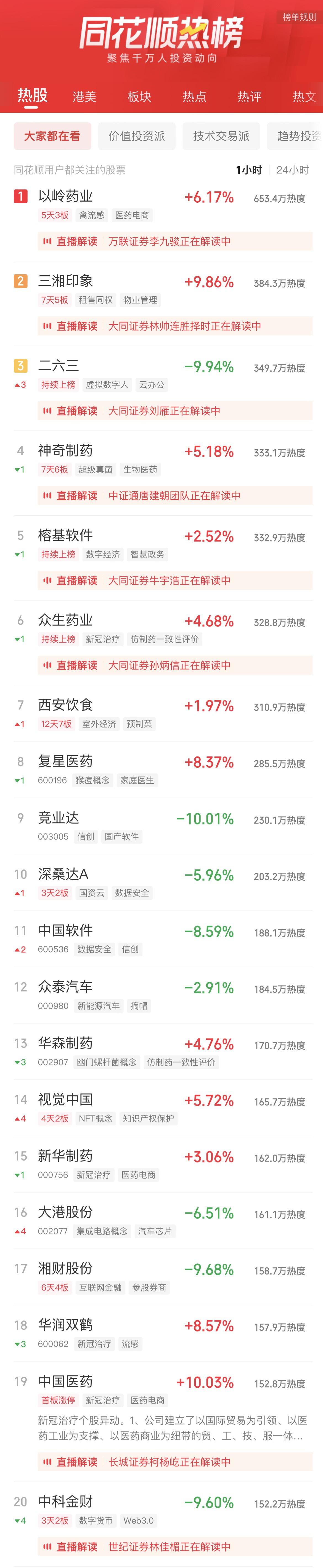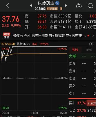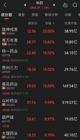 09:37 中药股持续活跃,抗病毒方向领涨,贵州百灵(002424)继续涨停2连板,新华制药(000756)、葫芦娃(605199)、亨迪药业(301211)、翰宇药业(300199)、以岭药业(002603)等纷纷冲高。