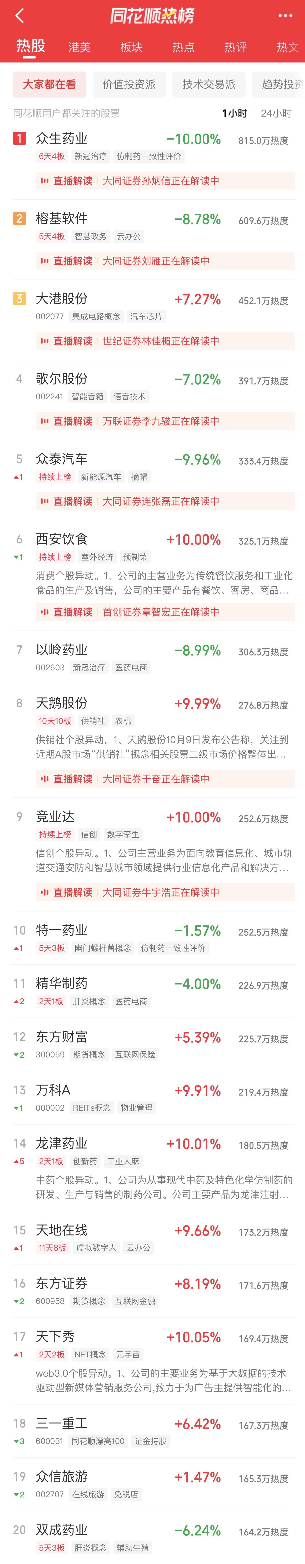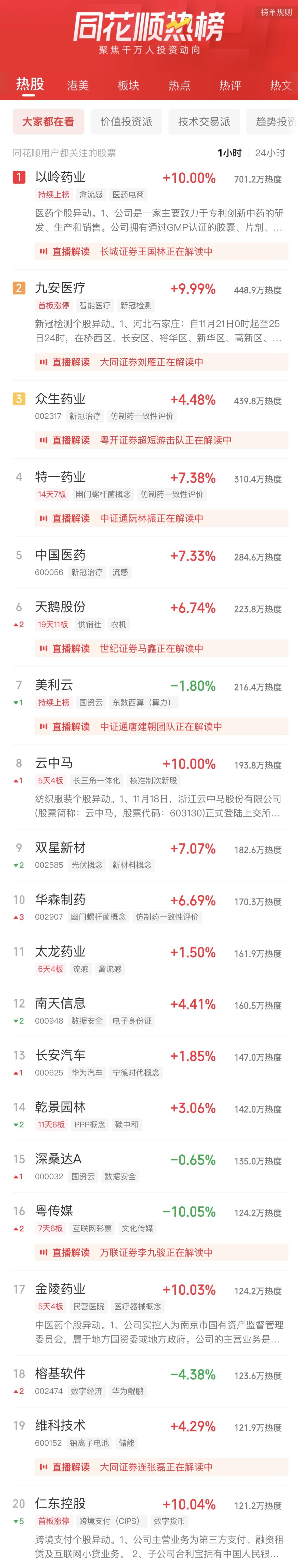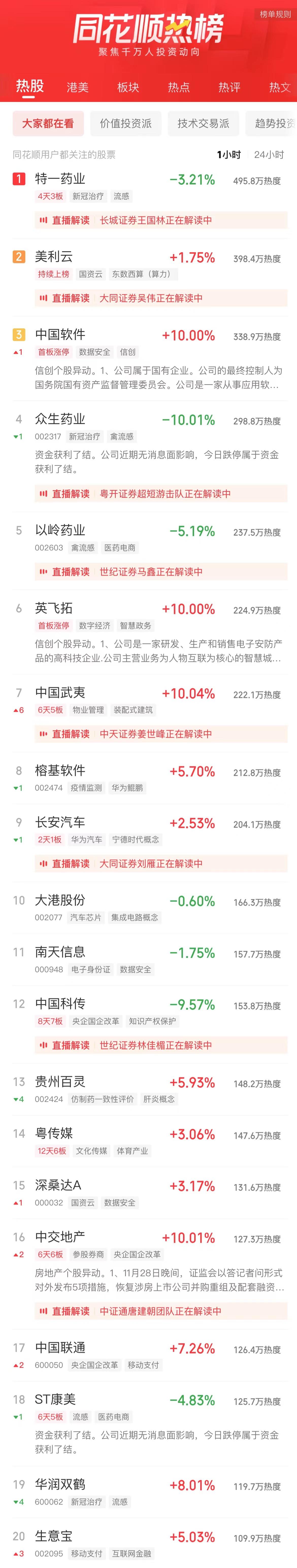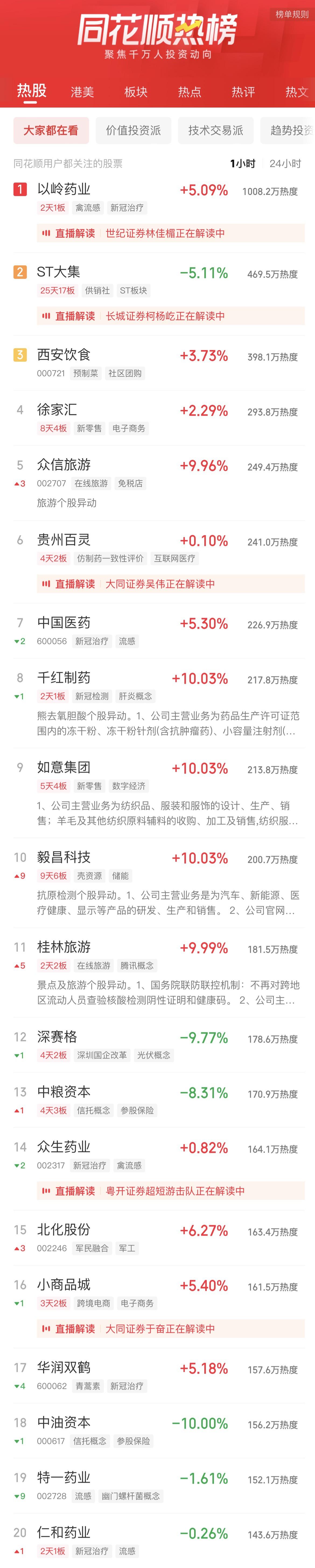 11:06 新冠治疗板块冲高回落,特一药业(002728)一度触及跌停,热景生物、众生药业(002317)、康缘药业(600557)、香雪制药(300147)等跟跌。