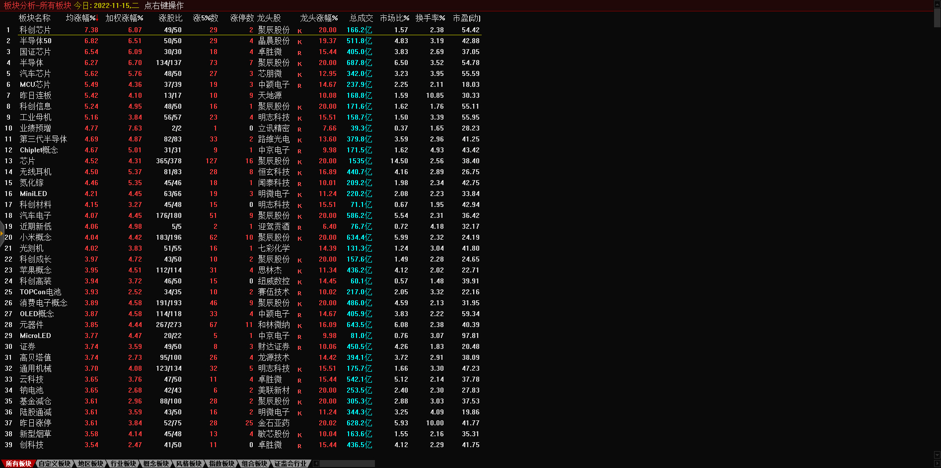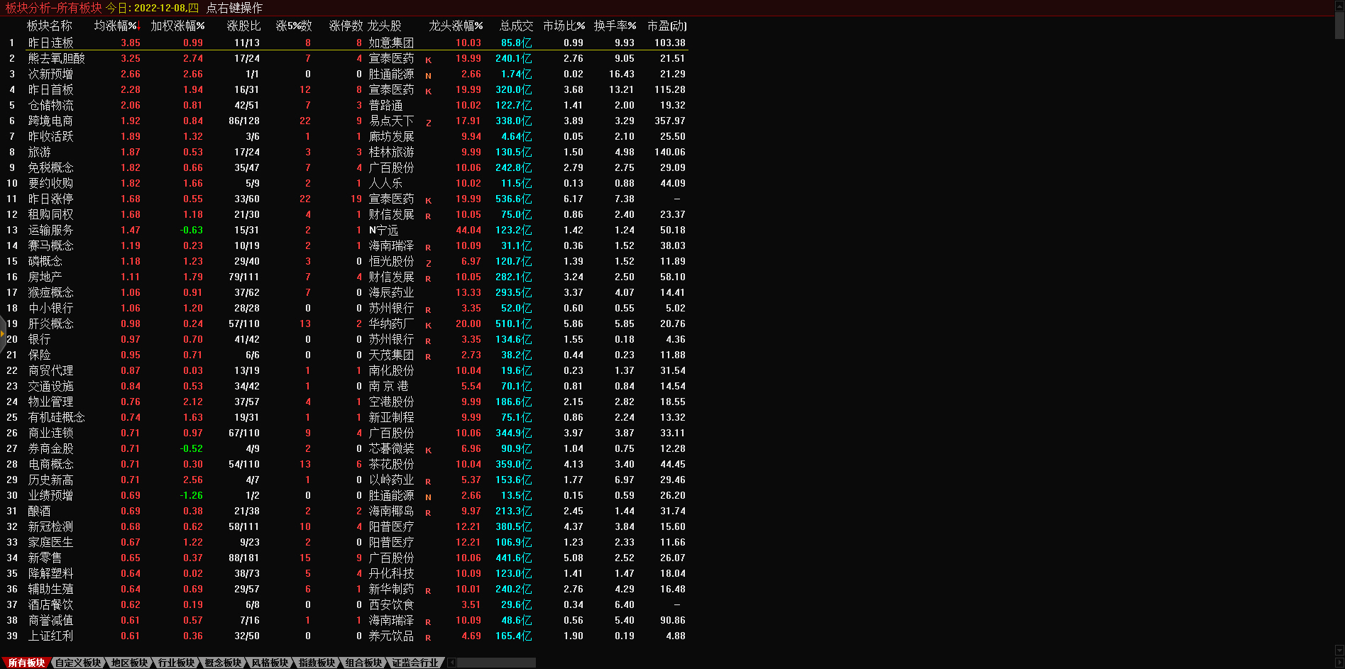 板块题材上,零售板块领涨两市,半导体芯片股涨幅居前,供销社概念股尾盘拉升,医药商业、数据确权全天走低。盘面上,零售板块掀涨停潮,板块内永辉超市(601933)、东百集团(600693)、中百集团(000759)、三江购物(601116)、小商品城(600415)、深赛格(000058)、徐家汇(002561)等近10股涨停;芯片股涨幅居前,博通集成(603068)、大港股份(002077)先后涨停,满坤科技(301132)涨超10%;供销社概念股尾盘拉升,天鹅股份(603029)涨停,敦煌种业(600354)回封涨停,天禾股份(002999)、中农联合(003042)、浙农股份(002758)、辉隆股份(002556)等跟涨;医药商业板块全天领跌,嘉事堂(002462)、塞力医疗(603716)、一心堂(002727)齐跌停;今日连板高标股再现退潮,15天14板永顺泰(001338)上演“天地板”。