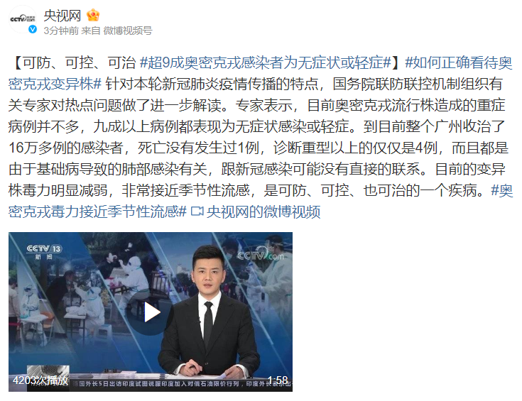 据央视网,针对本轮新冠肺炎疫情传播的特点,国务院联防联控机制组织有关专家对热点问题做了进一步解读。专家表示,目前奥密克戎流行株造成的重症病例并不多,九成以上病例都表现为无症状感染或轻症。到目前整个广州收治了16万多例的感染者,死亡没有发生过1例,诊断重型以上的仅仅是4例,而且都是由于基础病导致的肺部感染有关,跟新冠感染可能没有直接的联系。目前的变异株毒力明显减弱,非常接近季节性流感,是可防、可控、也可治的一个疾病。